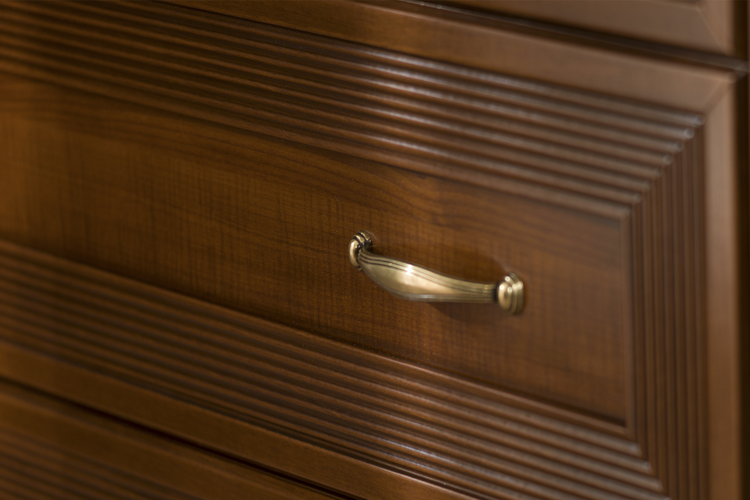 Общий стиль модели подчеркивают латунные ручки, отделанные в оттенке «античная бронза», и теплый коричневый цвет. Четыре вместительных выдвижных ящика оснащены скрытыми направляющими Quadro. Немецкая фурнитура обеспечивает стабильную работу механизмов и плавное, почти бесшумное движение элементов. Купить эффектную мебель можно через интернет-магазин «Ангстрем».