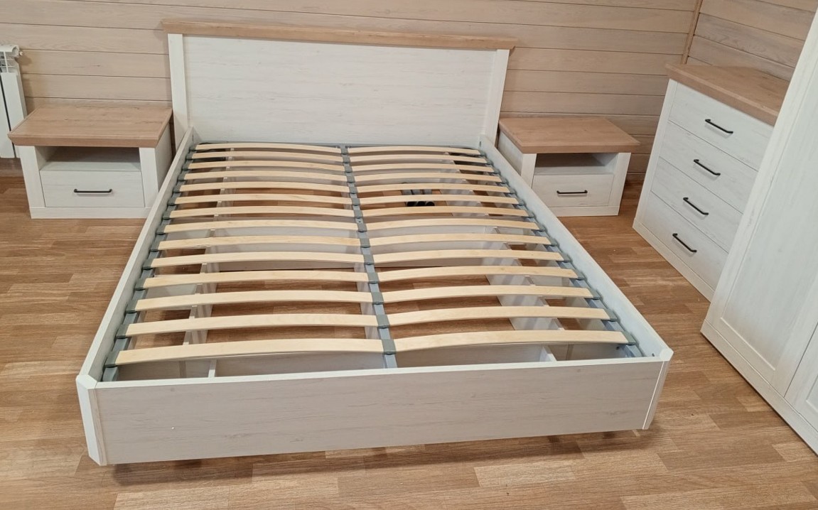 Модель с ортопедическим основанием из березовых ламелей предназначена для комфортного отдыха и здорового сна. Универсальное цветовое решение подойдет для интерьера в стиле кантри, прованс, сканди, облегченный лофт, минимализм, классика. Удачное сочетание древесной текстуры «дуб бунратти» с нейтральным оттенком «блан-шене» создает умиротворяющую атмосферу, которая так необходима в спальне.