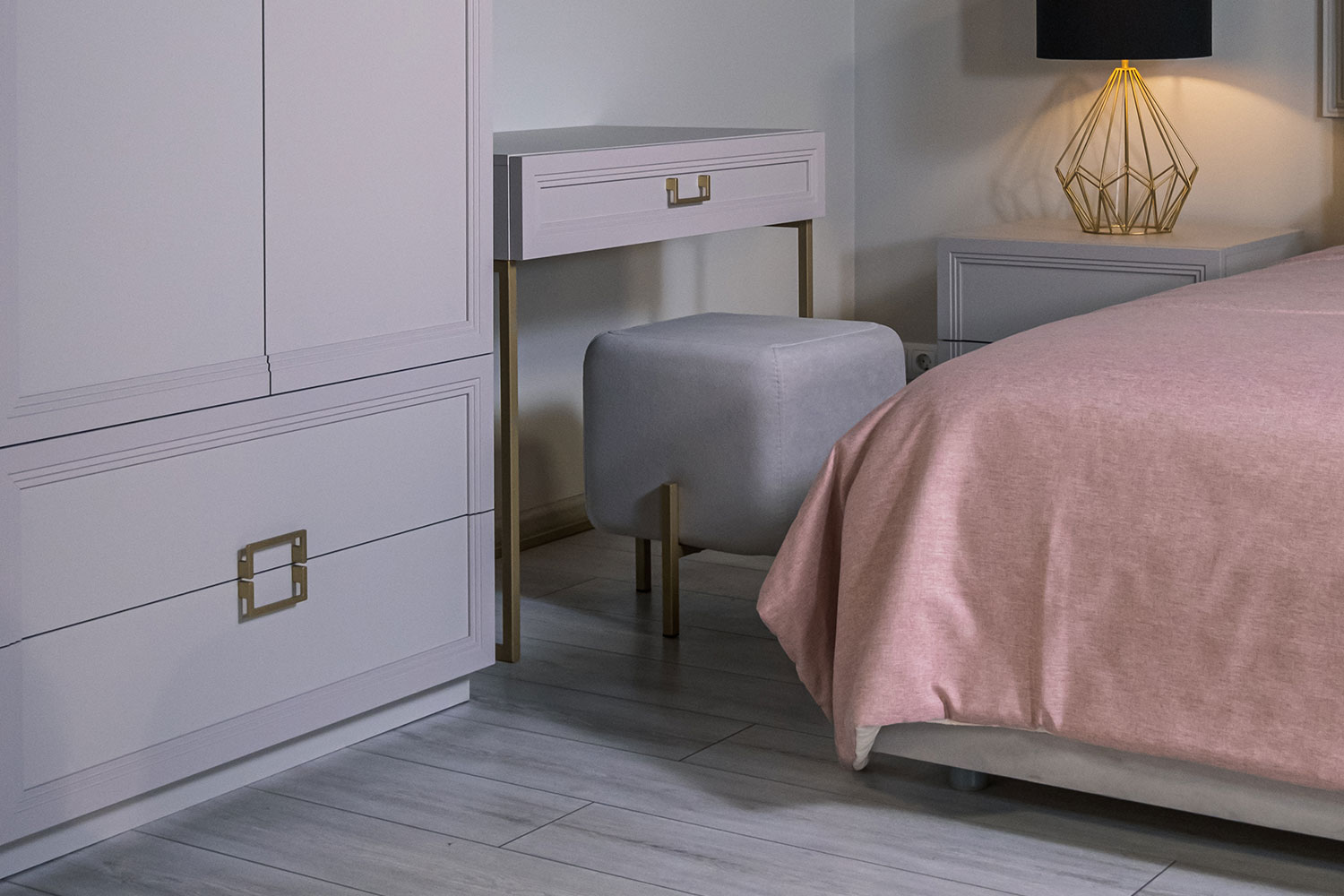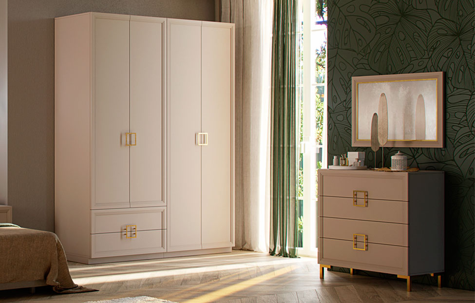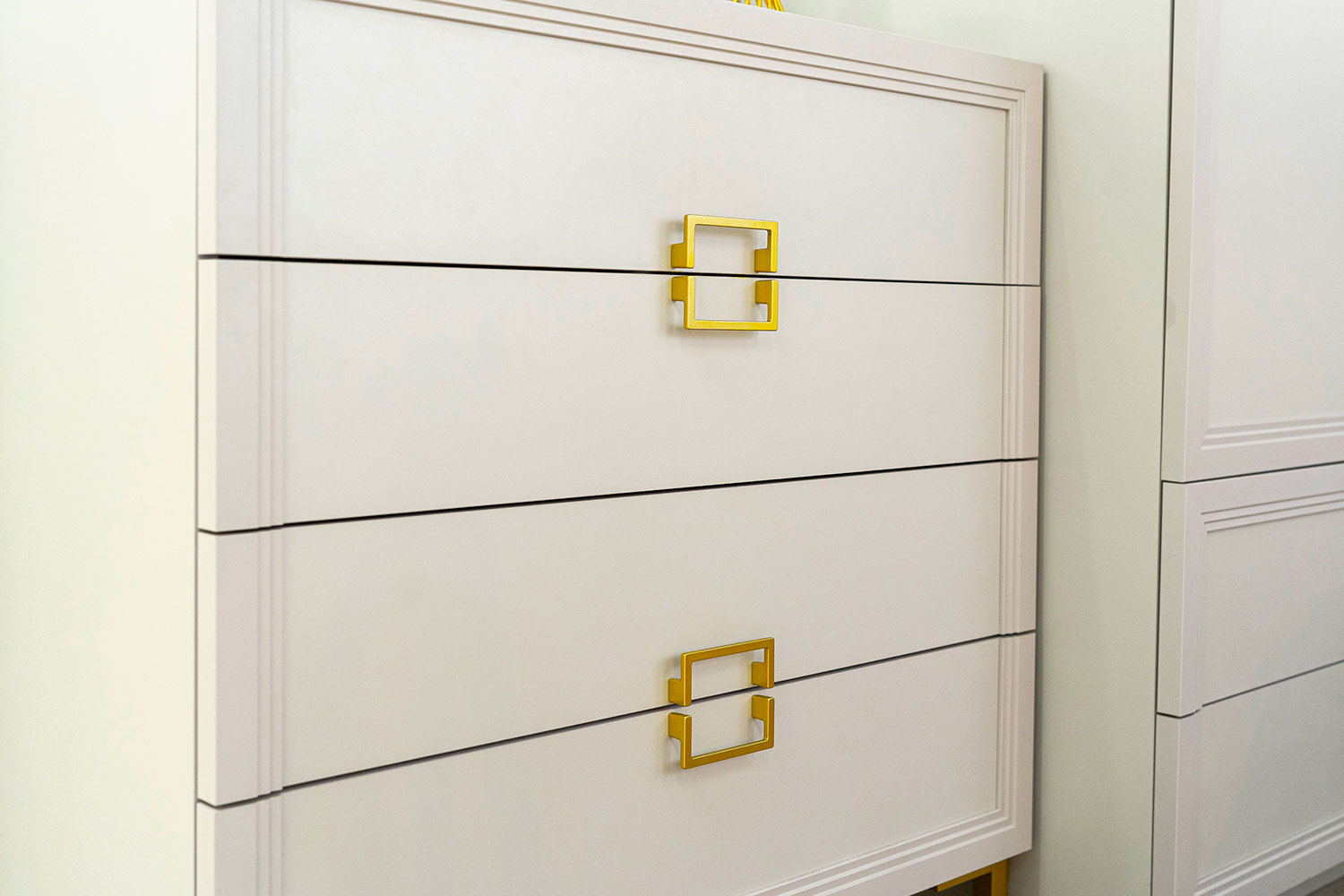 - Основу дизайна составляет геометрический символ — квадрат. Это видно по золотым матовым ручкам на тумбах, шкафах и комодах;