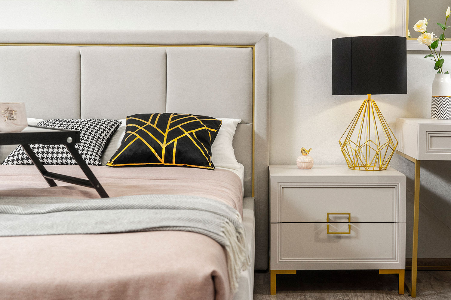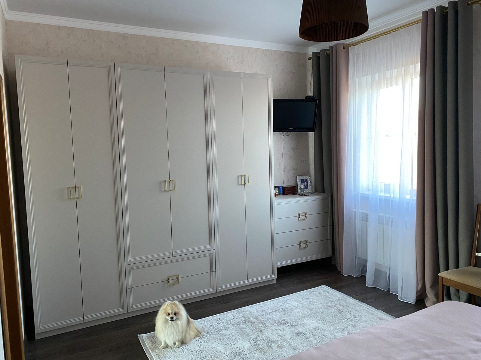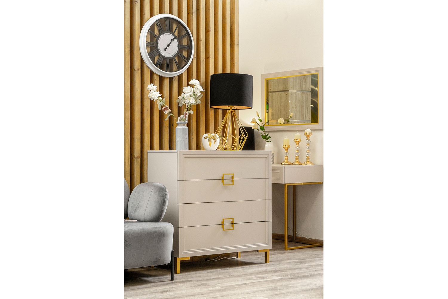 - Основу дизайна составляет геометрический символ — квадрат. Это видно по золотым матовым ручкам на тумбах, шкафах и комодах;