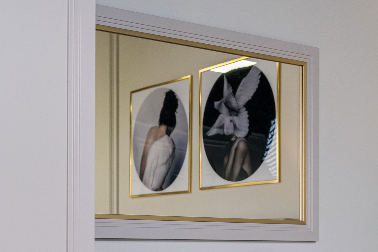 - Декоративная акцентная рама в изголовье кровати повторяет форму ручек.