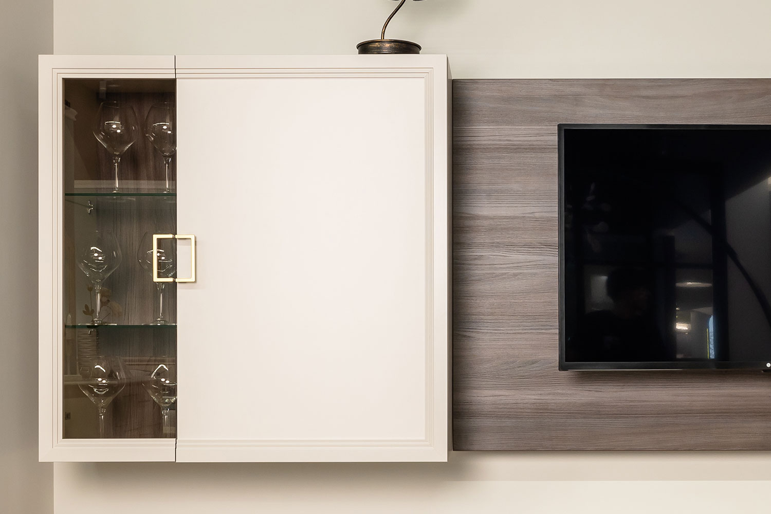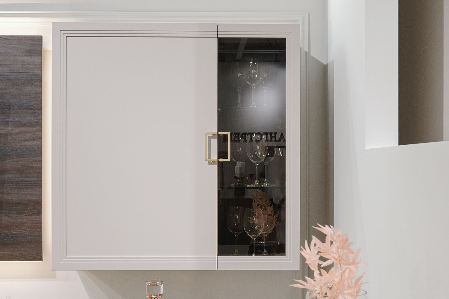 - Шкаф настенный с одним глухим фасадом и одним рамочным со вставкой стекло тонированное;