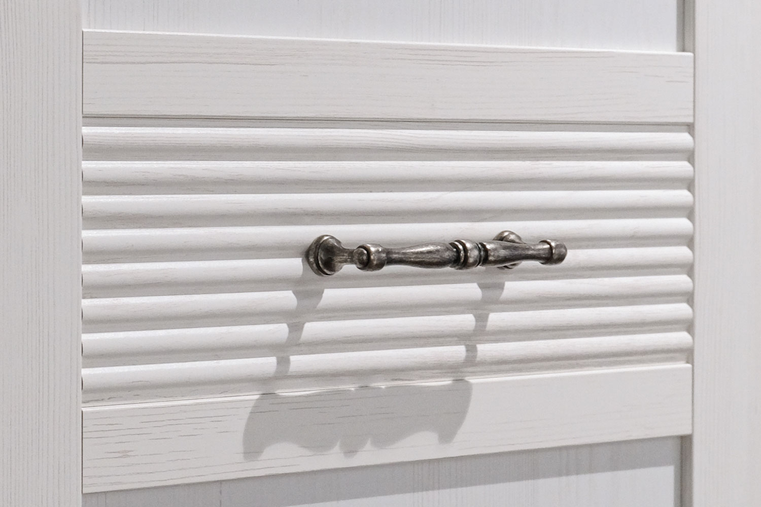 Мебель выполнена в оттенке «блан-шене», который прекрасно будет выглядеть на фоне как приглушенного, так и яркого окружения. Фурнитура имеет черное покрытие цвета «античное железо». Рамочные фасады, высокие скошенные ножки, изящные фахверки визуально облегчат корпусные предметы интерьера.