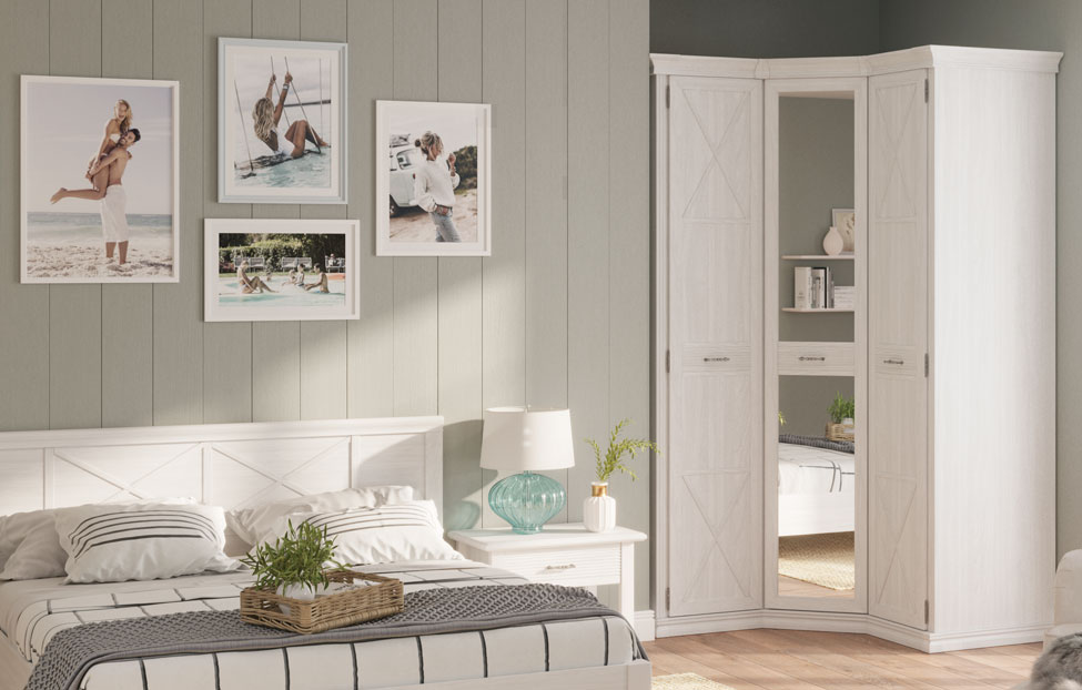 Классическое оформление спального гарнитура никогда не утратит своей актуальности. Мебельный комплект с традиционным дизайном идеально впишется в стиль кантри, прованс, неоклассика или сканди. Центральное место в помещении займет двуспальная кровать с высоким жестким изголовьем, декорированным накладками-фахверками. Вместительные системы хранения — два шкафа-пенала и угловой шкаф с зеркальным фасадом — помогут рационально организовать пространство и облегчат процесс сборов. Для размещения мелких аксессуаров подойдут прикроватные тумбы. В комплект также входят карнизы, цоколи и обрамленное минималистичной рамой зеркало.
