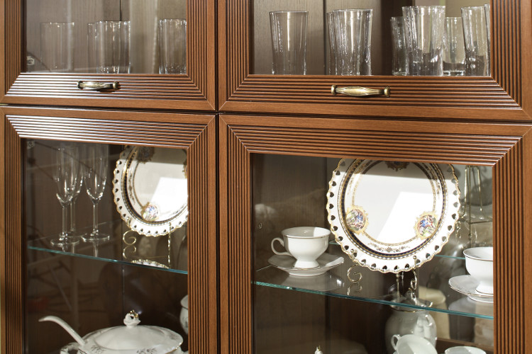 - На задних стенках шкафов со стеклянными вставками есть зеркала. Это помогает зрительно расширить комнату.