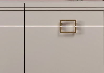 - Основу дизайна составляет геометрический символ — квадрат. Это видно по золотым матовым ручкам на тумбах и шкафах;