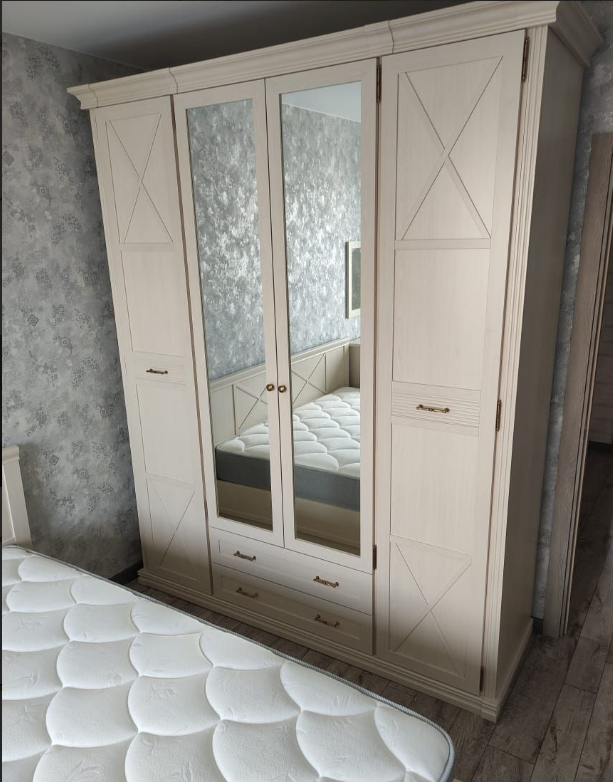 - Для хранения в спальне есть большой шкаф с двумя зеркалами. Поэтому можно увидеть свой образ сразу после переодевания, не выходя в ванную или коридор.