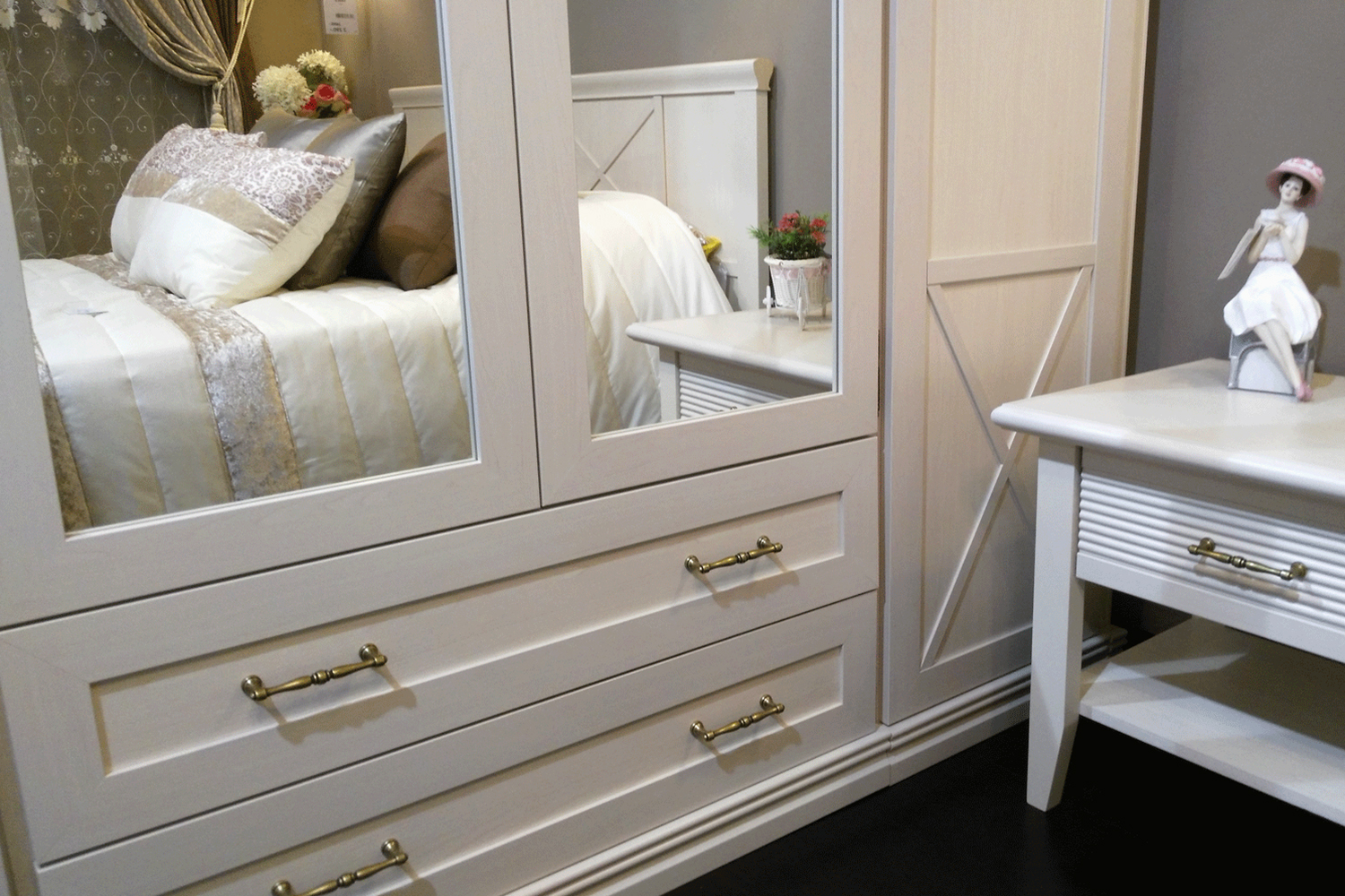 К этой мебели подойдут аксессуары в стиле неоклассика, ковры с винтажным потертым рисунком, плетеные пуфы и вязанные пледы. Если вы хотите добавить акцентов в интерьер — используйте стулья и кресла ярких оттенков, для более «спокойного» интерьера — выбирайте приглушенные тона. Не забудьте про туалетный столик, который сделает утренние и вечерние ритуалы еще приятнее.