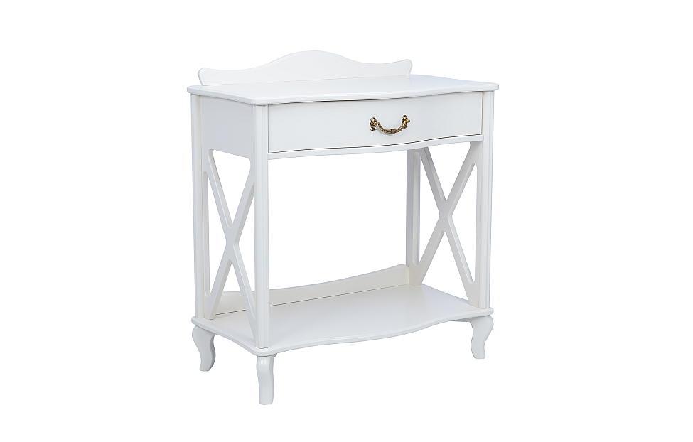 Узкий консольный столик «Джульетта» предназначен для декоративных целей — на небольшую поверхность можно поместить вазу, сувенир, необычную статуэтку. Внешний вид изделия соответствует интерьерному стилю прованс. Молочный оттенок, фигурная форма, изогнутые ножки, фурнитура в цвете «античная бронза» превосходно впишутся и в классическую обстановку. Основание модели выполнено из МДФ, боковины и столешница — из ЛМДФ, прочие детали изготовлены из шпона натурального ясеня. Изюминка консоли — боковые части в виде декоративных элементов фахверков. В компактном ящике с бесшумным механизмом выдвижения можно хранить любимые книги, очки, различные мелочи.