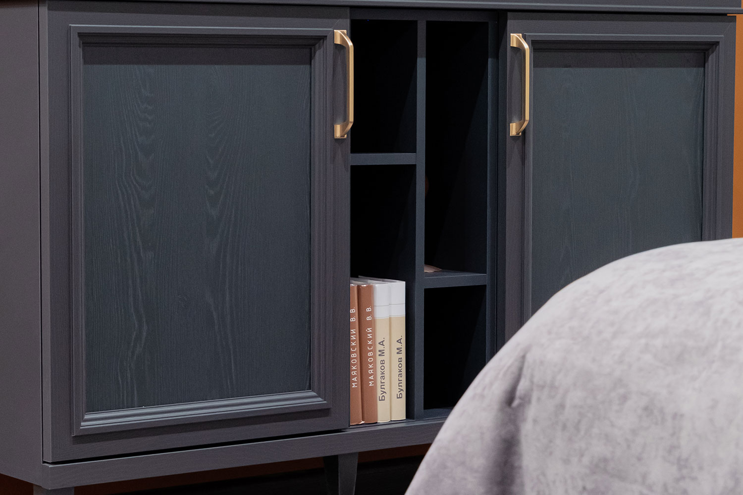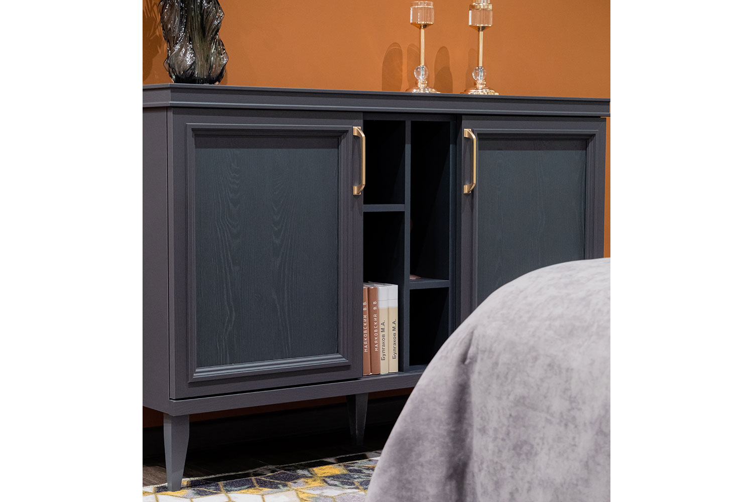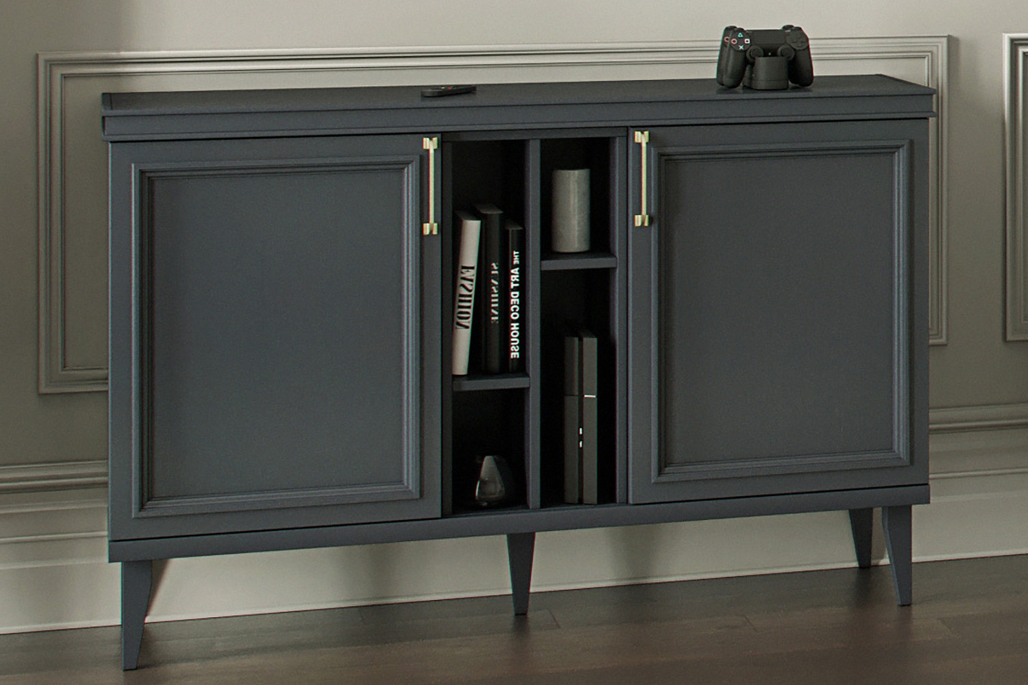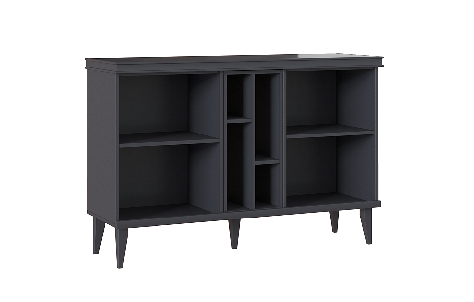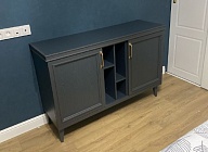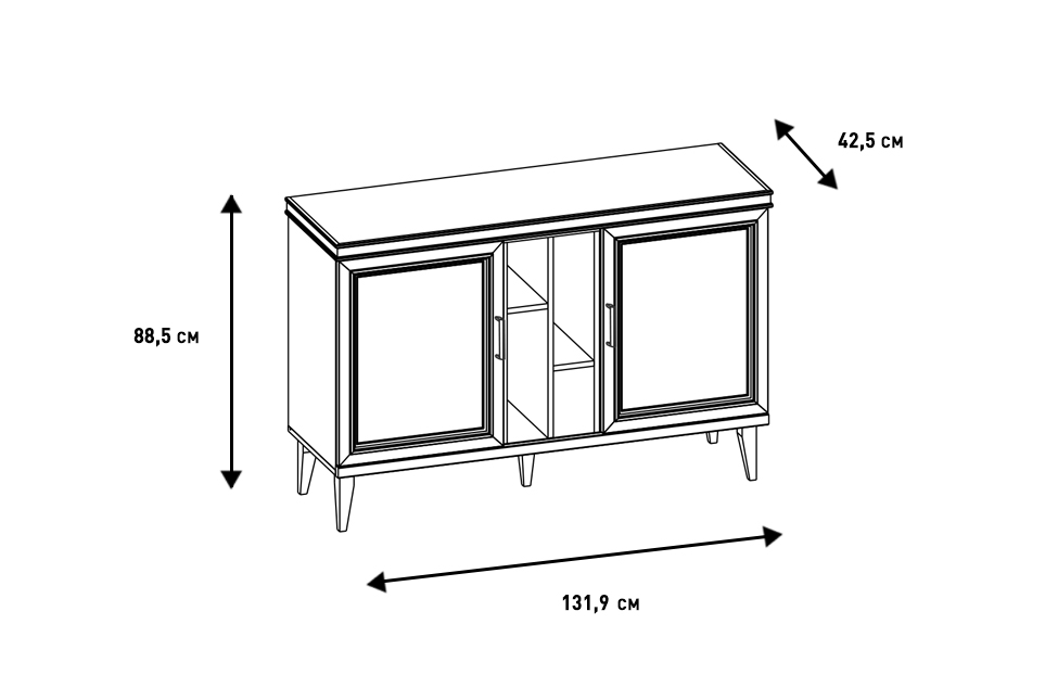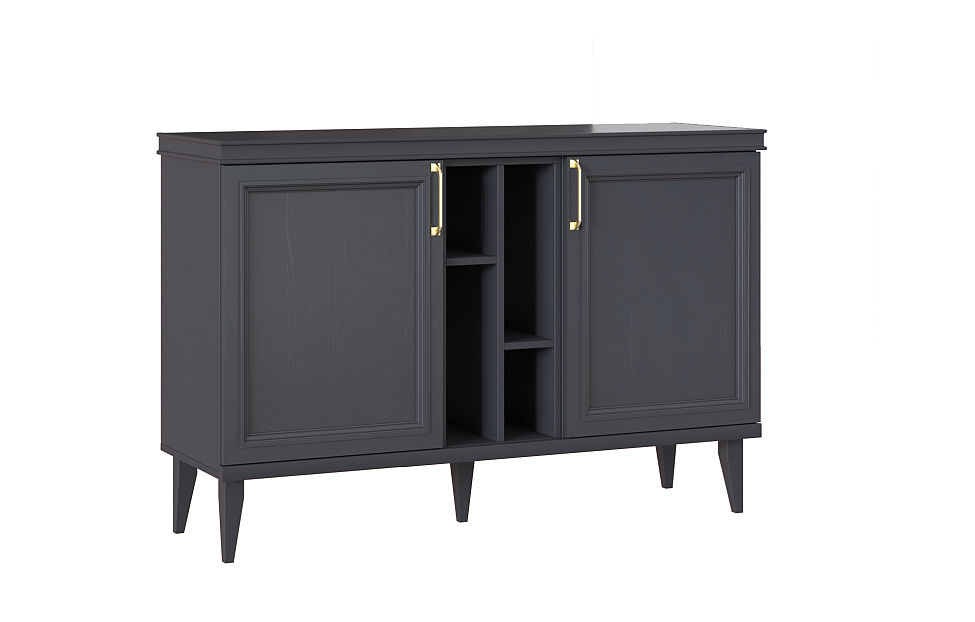 - Комод с тремя секциями: средняя секция — с двумя полками, за распашными фасадами — по одной съемной щитовой полке;