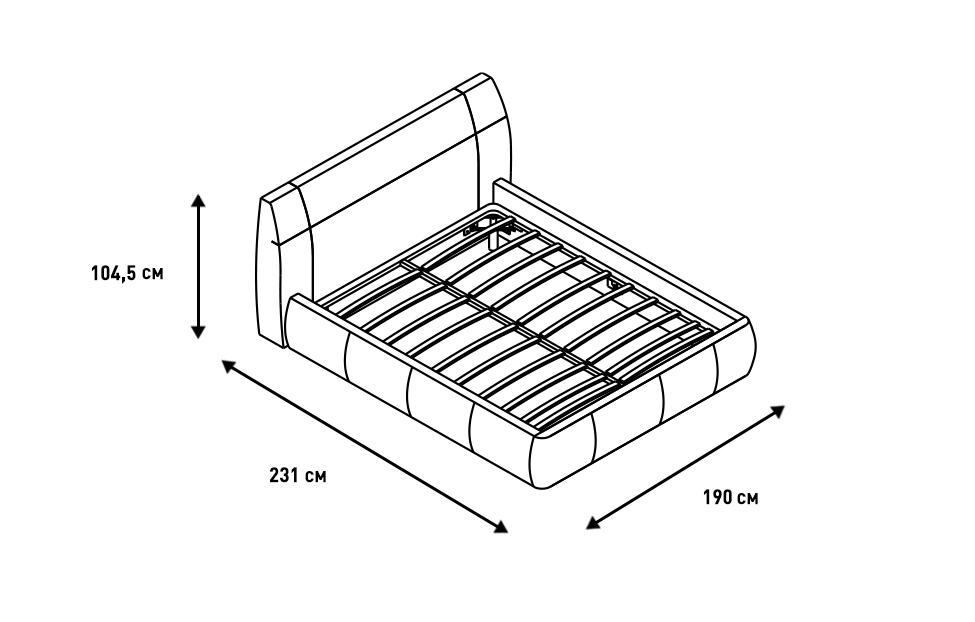 Конструкция изготовлена из ДСП и качественного бруса первой категории. Спальное место оснащено ортопедической решеткой, состоящей из металлической рамы и упругих березовых ламелей. Декоративные ножки-опоры выполнены из древесины твердолиственной породы. Размер поверхности — 160 x 200 см — позволяет с комфортом расположиться сразу двум потребителям. Матрас приобретается отдельно, в стоимость не входит.