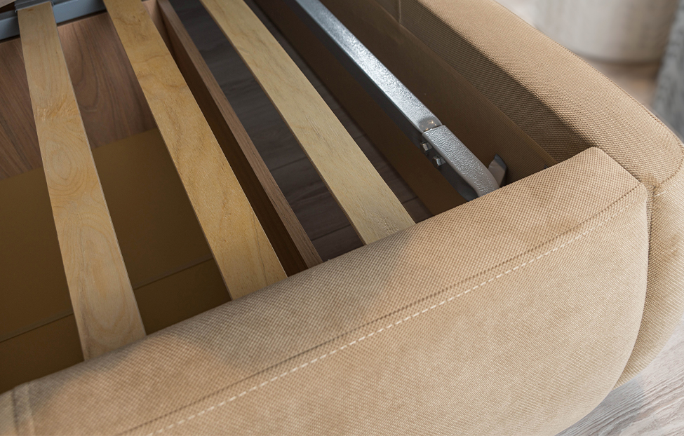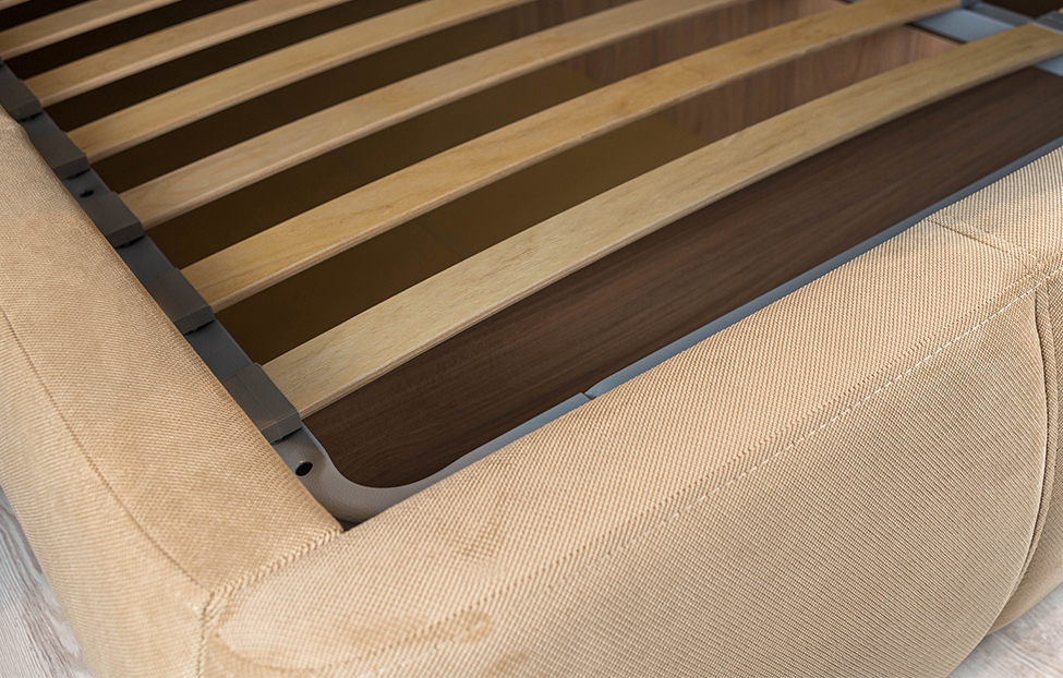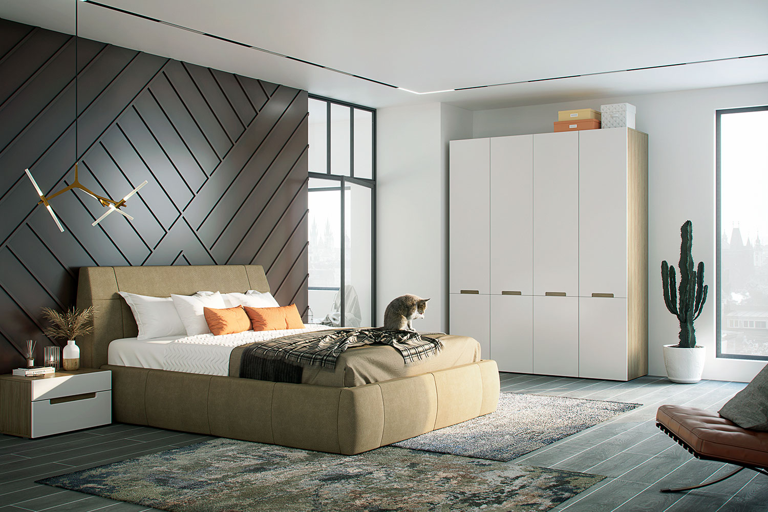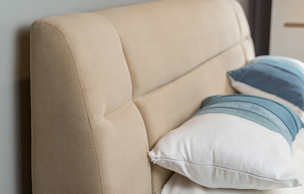 Элегантная лаконичная модель станет притягательным центром спальни в стиле неоклассика, кантри, сканди или минимализм. Теплый оттенок «швейцарский вяз» великолепно гармонирует с плавными контурами мебели и бархатистой фактурой обивки. Мягкий каркас изготовлен из высокоэластичного пенополиуретана, спанбонда и синтепона — такая отделка обеспечивает полную безопасность при эксплуатации изделия. Минималистично оформленное изголовье декорировано тонкими линиями утяжных элементов.