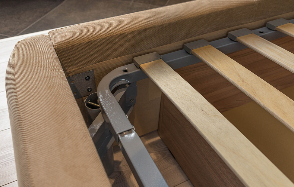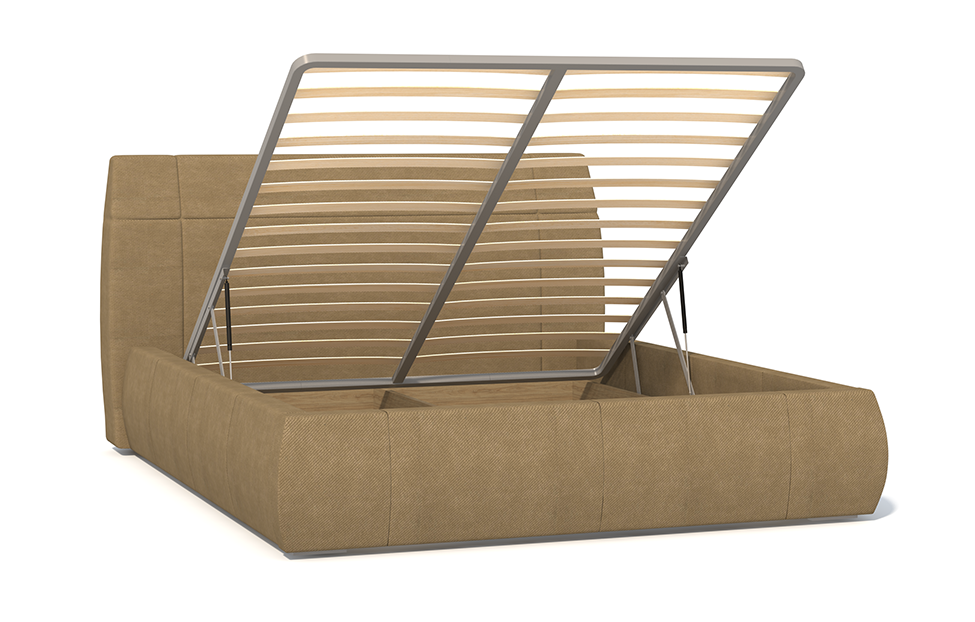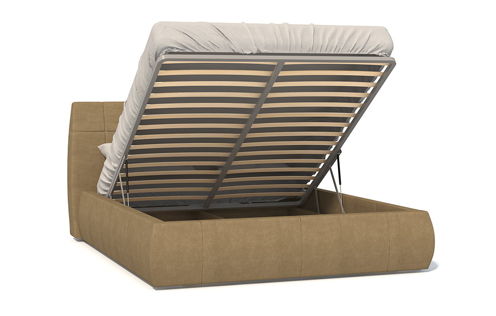Основание из металлического периметра и ортопедических гнутоклееных лат обеспечит высокий уровень комфорта. Изделие выполнено из ДСП и первосортного хвойного бруса, ножки — из древесины твердолиственной породы. Мягкая часть изготовлена из нетканого материала спанбонд, синтепона и пенополиуретана. Меблировка оснащена удобным в эксплуатации подъемным механизмом и бельевым ящиком из ЛДСП. Изголовье модели декорировано редко расположенными утяжными элементами.