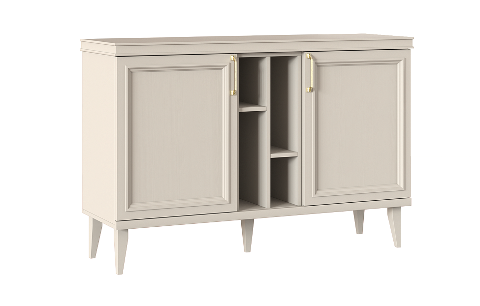 Комод включает три секции: за боковыми дверцами спрятаны съемные полки, среднее отделение состоит из асимметричных открытых отсеков. Демпферы и доводчики отвечают за плавное и беззвучное движение фасадов. Для установки требуется ровное напольное покрытие, а если мебель монтируется отдельно, ее следует дополнительно крепить к стене.
