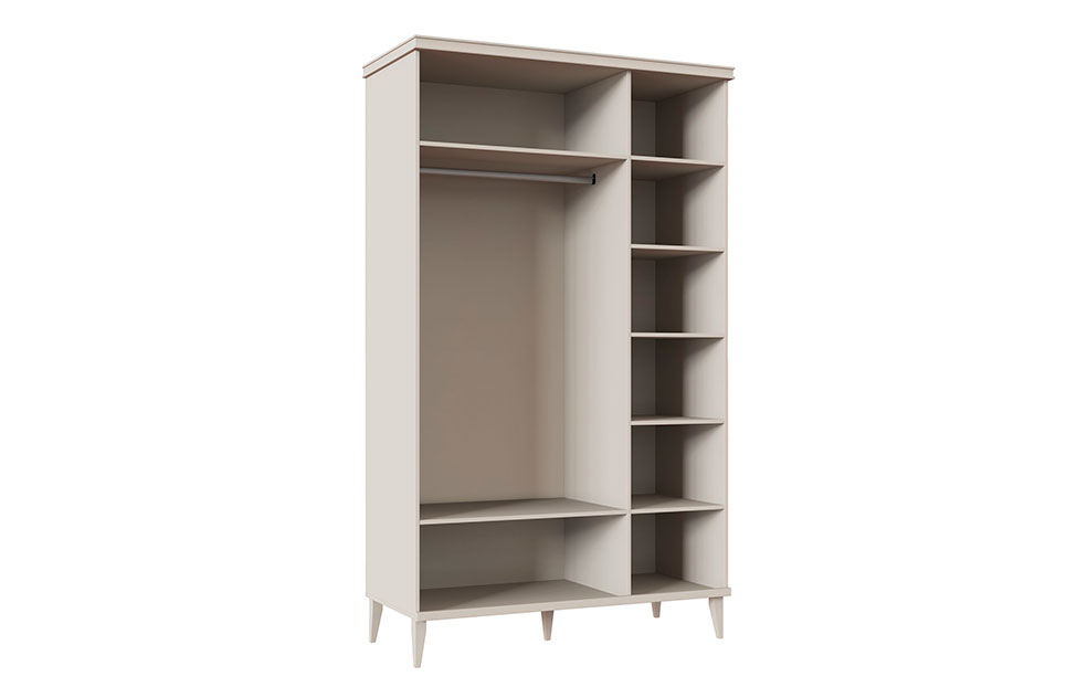 - Узкое отделение укомплектовано полками, широкое отделение — 2 полками и штангой для одежды;