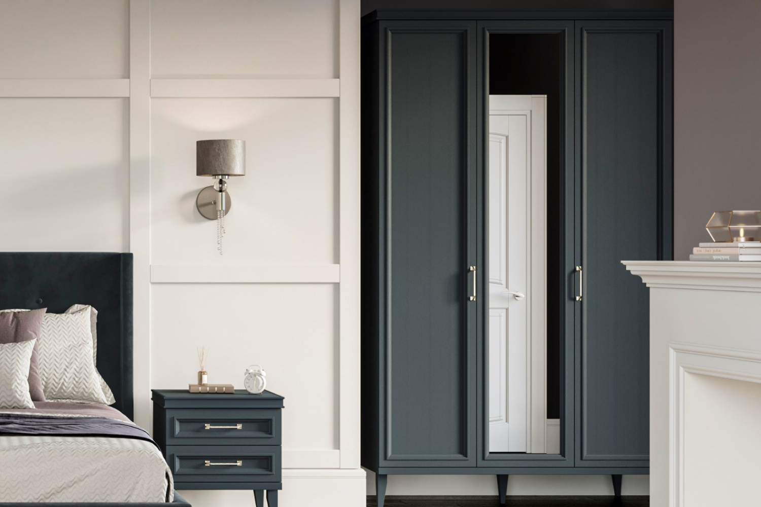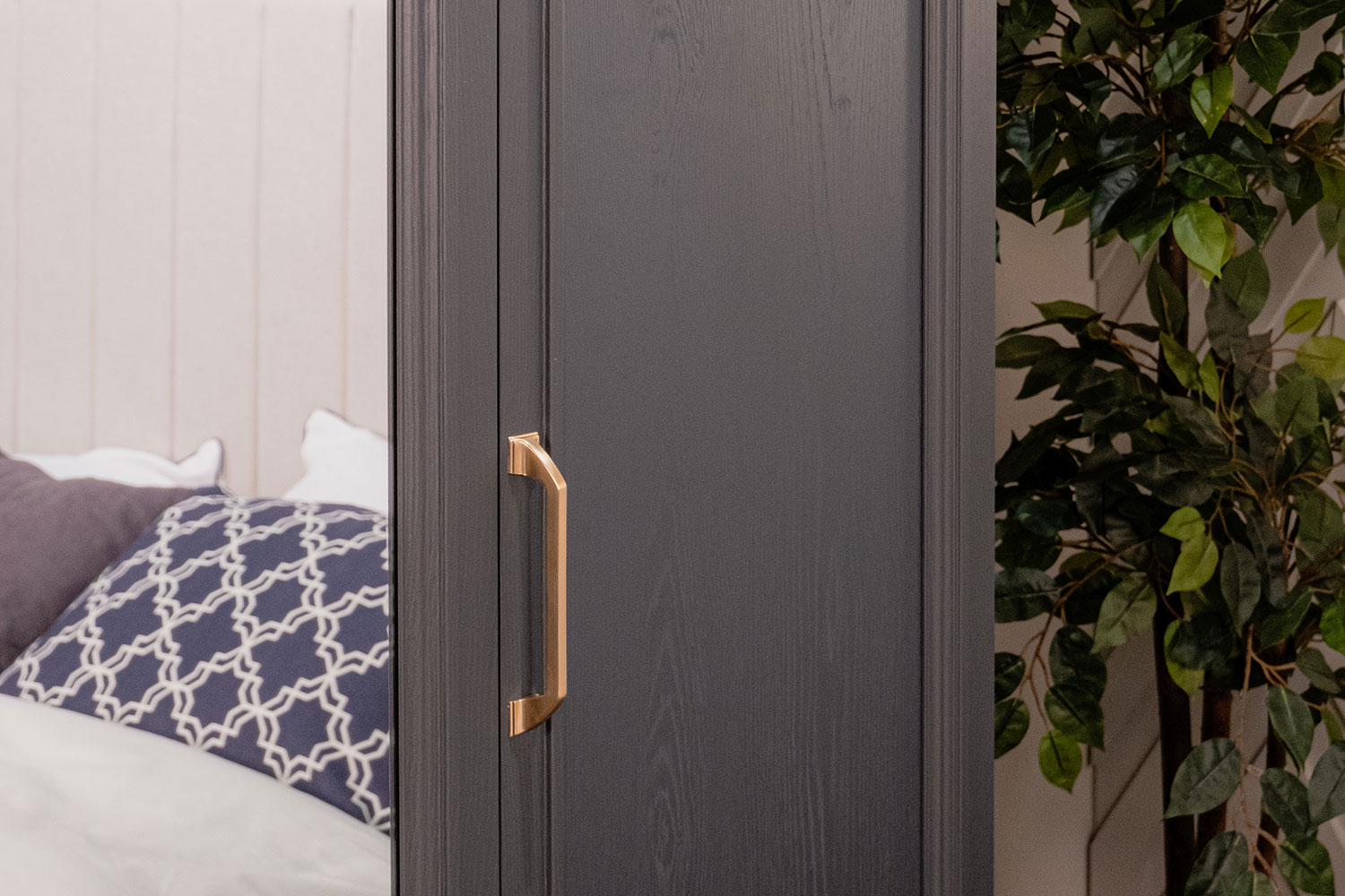 - Шкаф трёхстворчатый с двумя отделениями: в узком отделении — пять полок, в широком отделении — две полки и штанга для одежды;