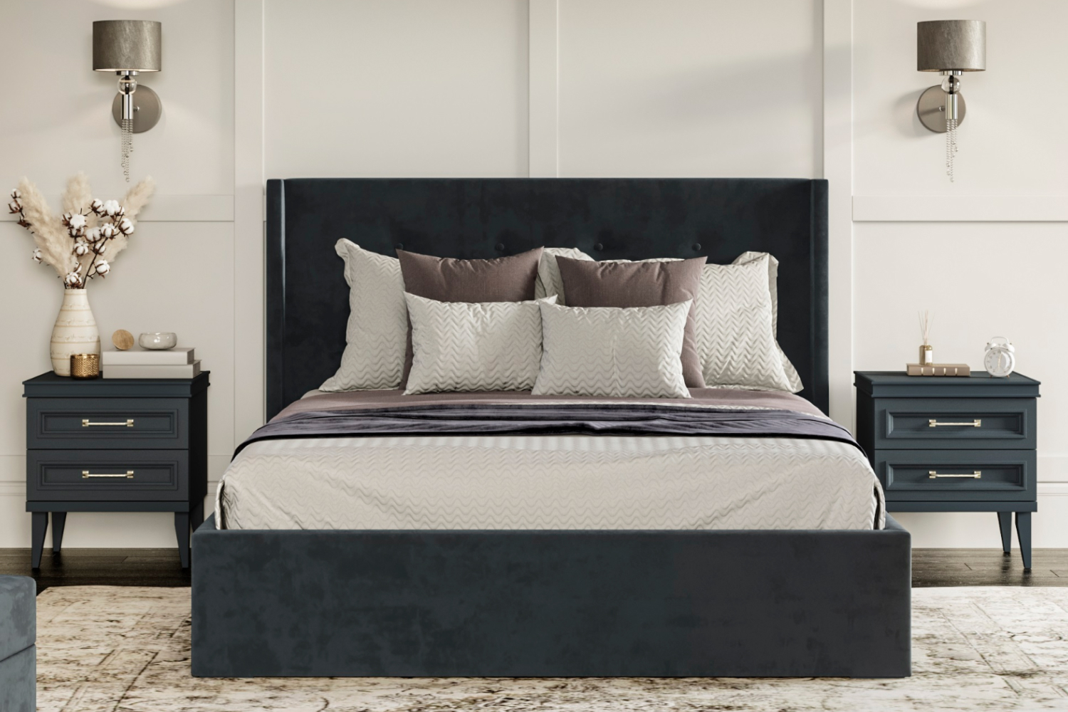 - Детали кровати обтянуты тканью Avelina (9852), изголовье декорировано пуговицами;