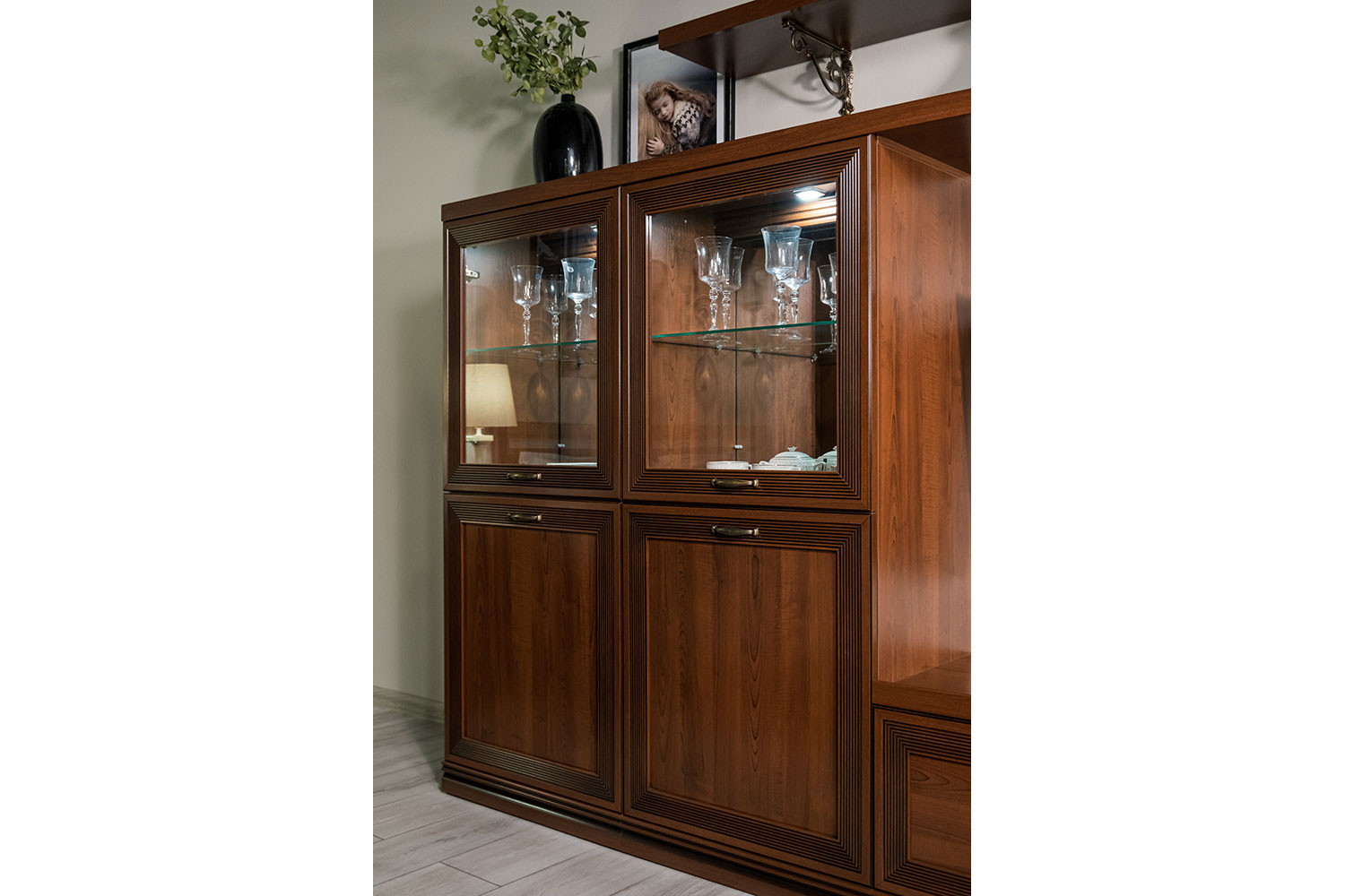 Внешнюю массивность шкафов облегчают открытые навесные полки и застекленные дверцы со внутренними зеркальными стенками. Благодаря этому меблировка не выглядит громоздкой, излишне тяжелой. Красивый природный рисунок подчеркнут патиной и лаком с шелковистой текстурой. Три напольных шкафа, настенные полочки, компактная тумба позволят разместить все самое необходимое.