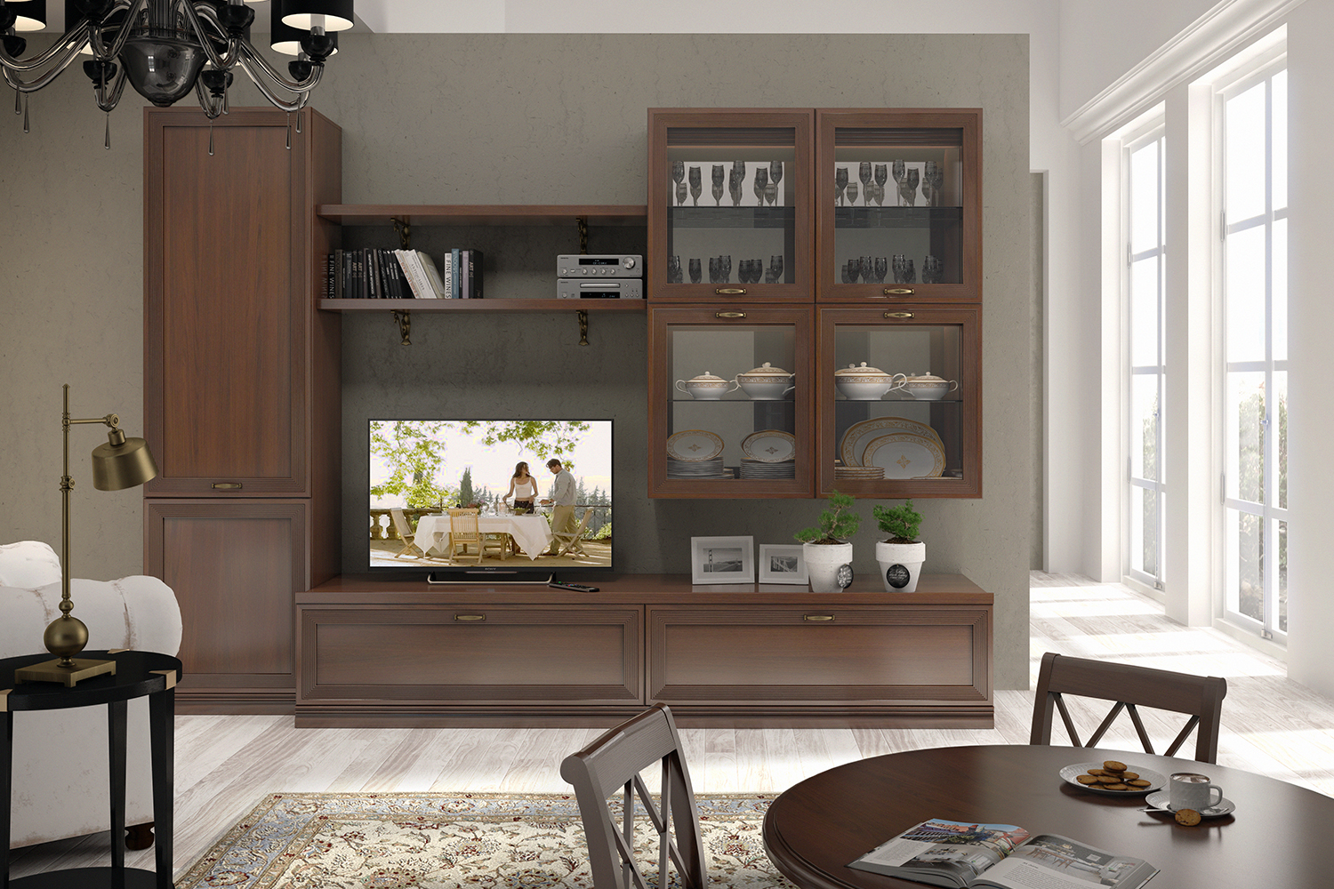 - Гостиная Адажио понравится семейным людям, ценителям классики и традиций. Она создана для уютных вечеров с близкими людьми, размеренному чтению любимых книг и просто приятных кинопросмотров за кружкой чая;