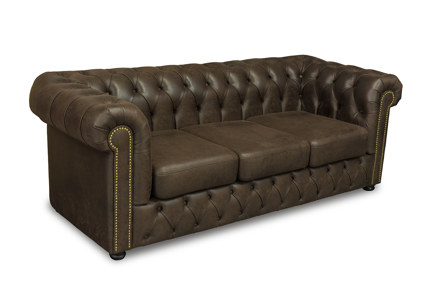 Классическая самодостаточная модель в темно-коричневой замшевой обивке соответствует требованиям элитного вкуса. Спинка и царга украшены ромбовидной стяжкой-капитоне, подлокотники закруглены в стиле барокко и составляют единое составляющее со спинкой. Согласно традициям, сиденье представляет собой ровную, гладкую поверхность, а круглые ножки едва ли видны для постороннего взгляда. Дополнительно изделие декорировано гвоздиками. Элегантный диван будет выглядеть в английской обстановке, но при правильно выстроенном окружении впишется и в лофтовый интерьер.