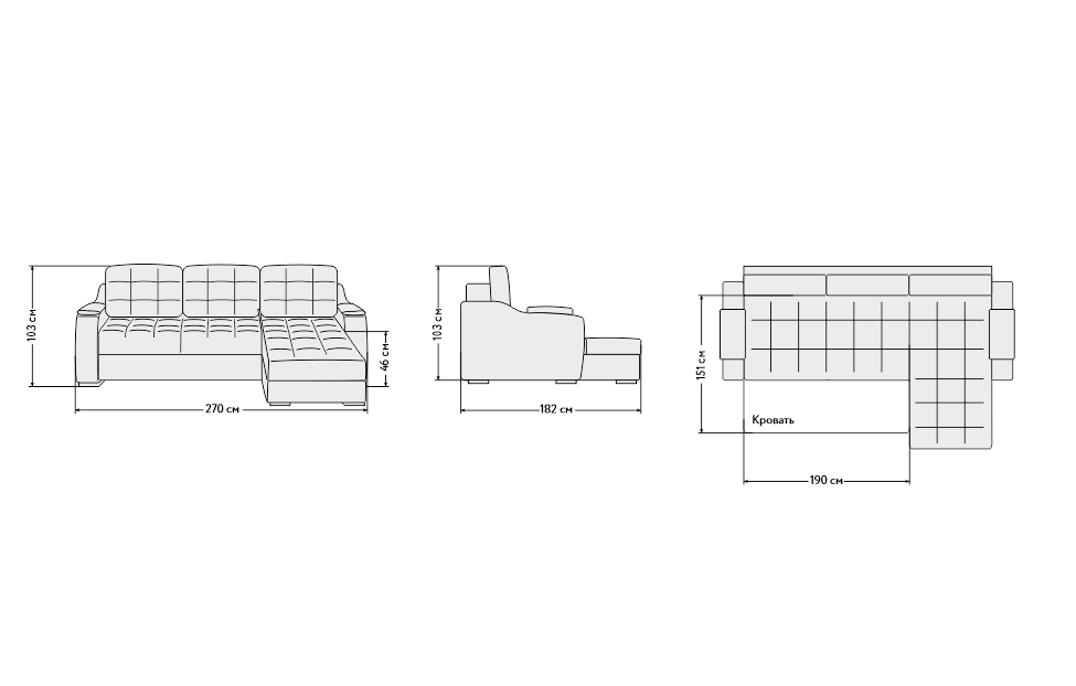 - Длинна по спинке: оттоманки — 98 см, дивана — 172,5 см, итоговая — 270,5 см;