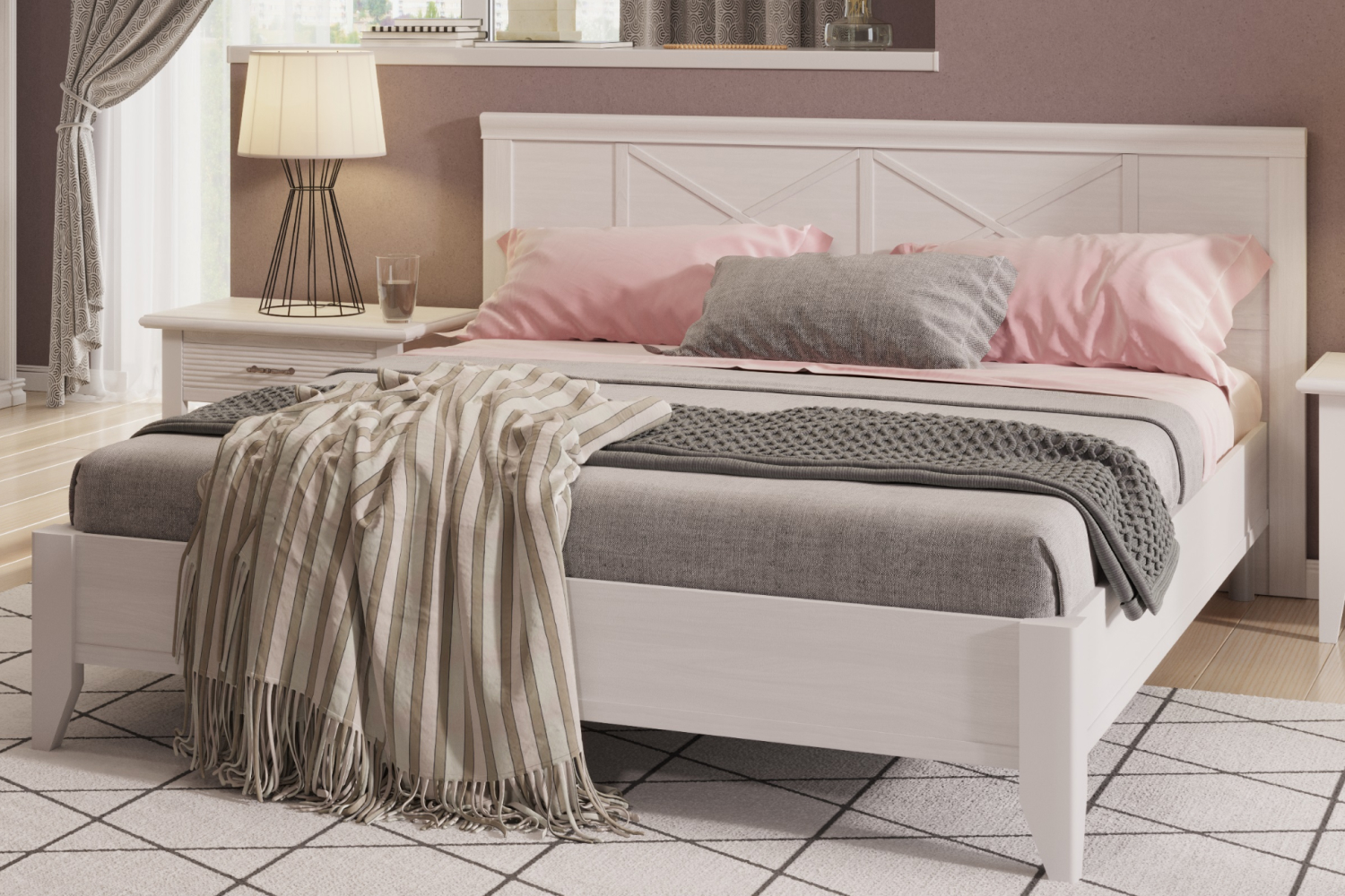 - Шкафы, комод и кровать украшены изящными фахверками. Эти декоративные элементы отсылают к Старой Европе и создают дополнительные неброские акценты в интерьере;