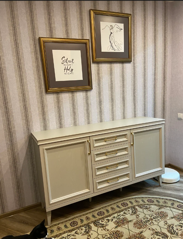 Комод состоит из трех основных секций — двух распашных боковых и центрального с четырьмя ящиками. Максимально возможная нагрузка для ящиков составляет 7 килограммов, при этом груз необходимо распределять равномерно. За боковыми фасадами скрываются полки из ламинированной ДСП.