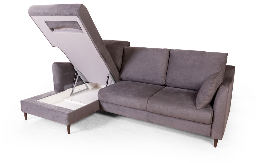 Диван оснащен двумя ящиками для хранения белья. Они расположены под оттоманкой и сиденьями.