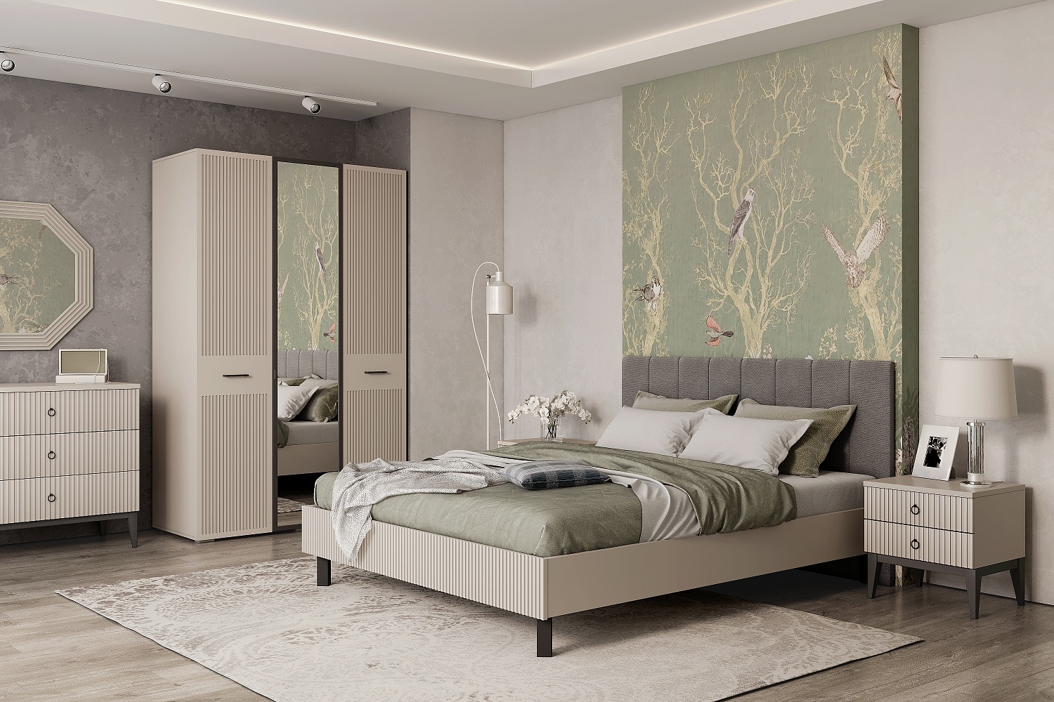 • Для хранения в спальне есть большой шкаф с зеркалом элегантного пепельного оттенка «графит», что придаёт дополнительный шарм коллекции;