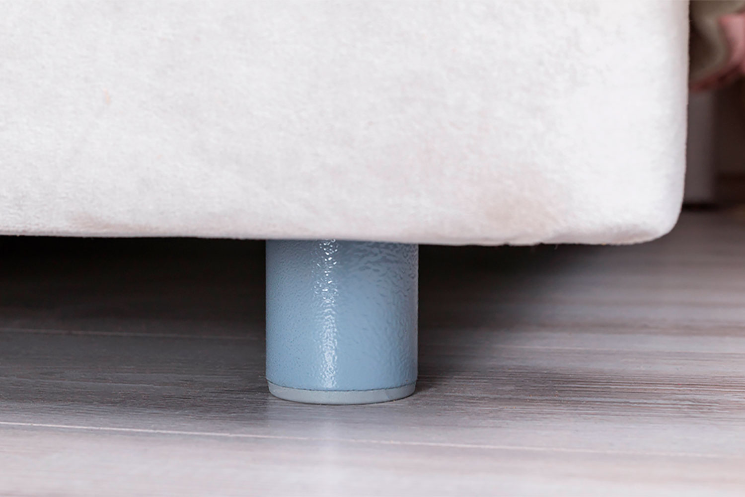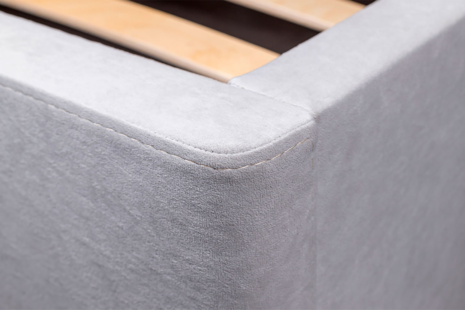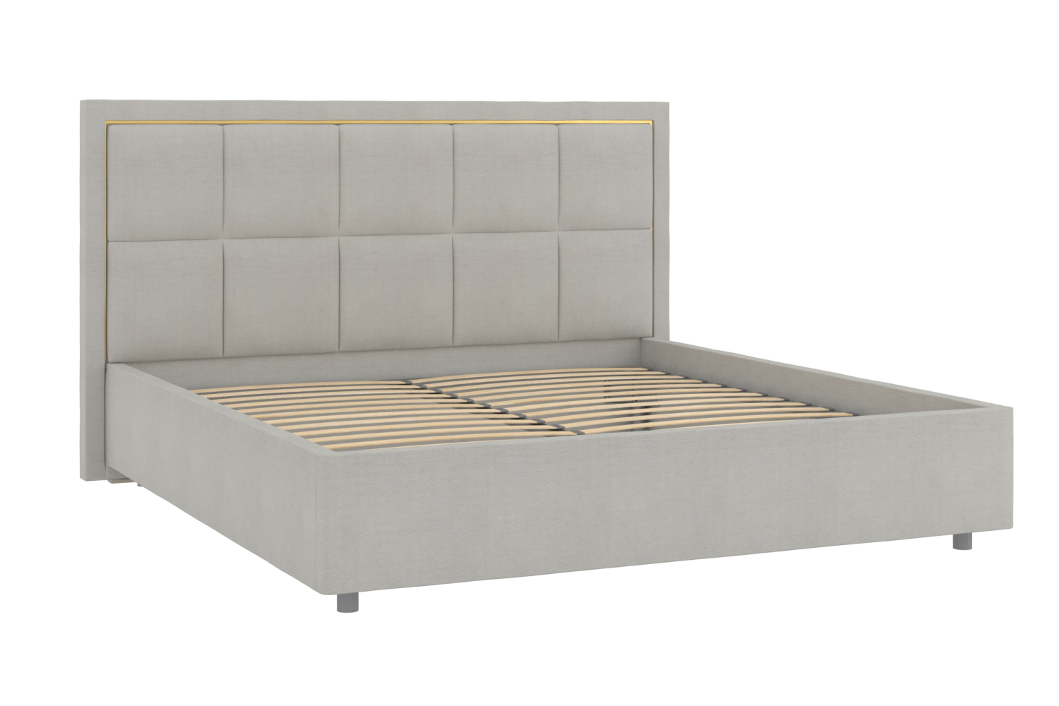 Обивка стильного оттенка «серый кашемир» выполнена из практичного и износостойкого микровелюра. Высокое изголовье простегано декоративной строчкой, украшено по периметру золотой окантовкой. Каркас изделия изготовлен из ламинированной ДСП. Мягкая отделка сводит риск травматизации в ночной атмосфере спальни к минимуму. Упругие ламели ложа обладают ортопедическим эффектом. Металлические ножки-опоры окрашены порошковой краской в серый цвет.