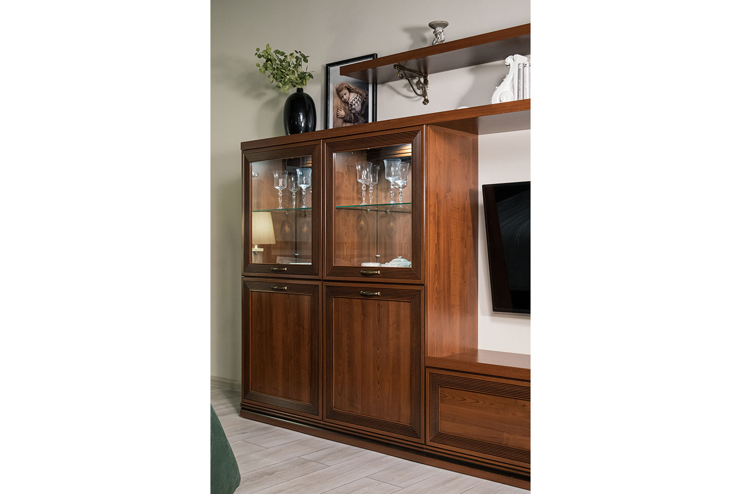 - В гостиной есть вся необходимая мебель для хранения: три напольных шкафа, тумба и две вместительные полки. Для самого важного всегда найдется место;