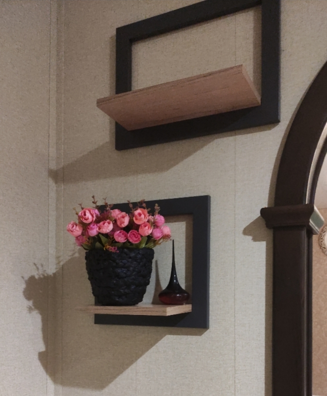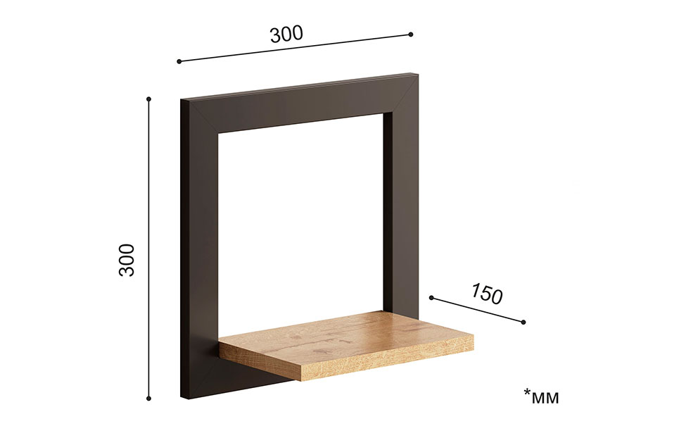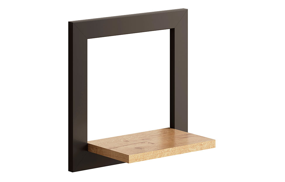 Открытая квадратная полочка выглядит нестандартно за счет формы и контрастной оправы. Рама изделия изготовлена из профиля МДФ, окрашенного полимерной краской матового графитового цвета. Выступающая часть изделия выполнена из ламинированной ДСП, текстурированной под светлую древесину «дуб бунратти».