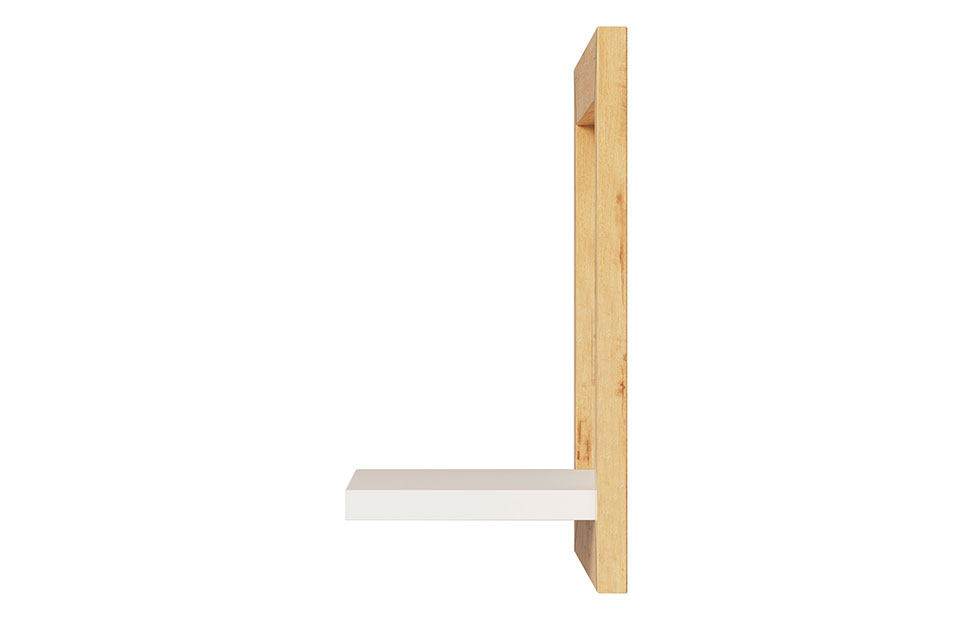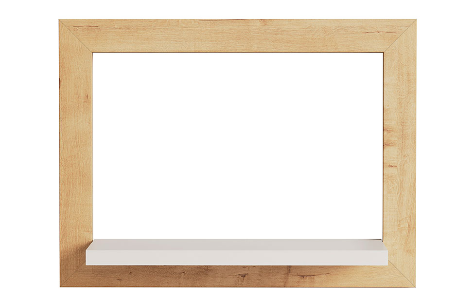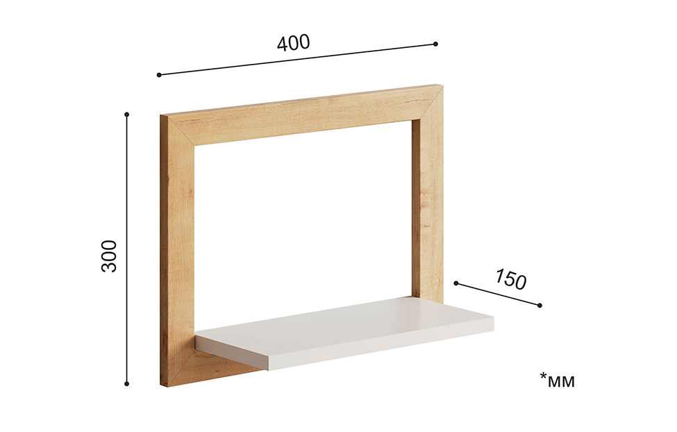 Основная часть изделия выполнена из ламинированной ДСП теплого оттенка «дуб бунратти», а рамочное обрамление изготовлено из МДФ-профиля. В комплекте идет скрытый крепеж — держатель, и навес. Допустимая нагрузка на древесно-стружечную плиту составляет 2 кг распределенного груза.