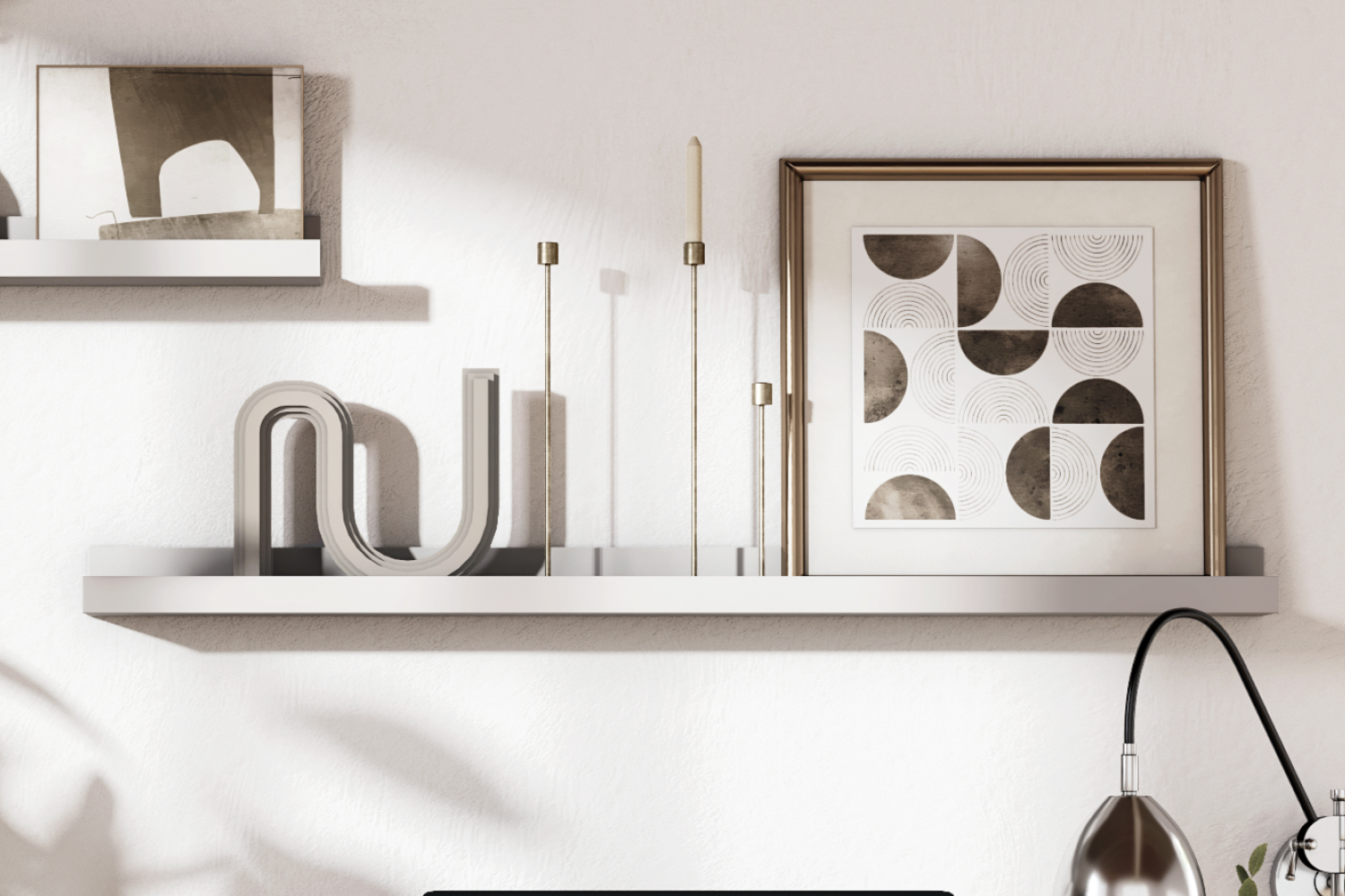 Полку можно использовать в композиции — комбинировать несколько вариантов размеров, чтобы создать настоящую галерею семейных фотографий или картин. Передний ограничительный профиль не даст соскользнуть предметам с полки.