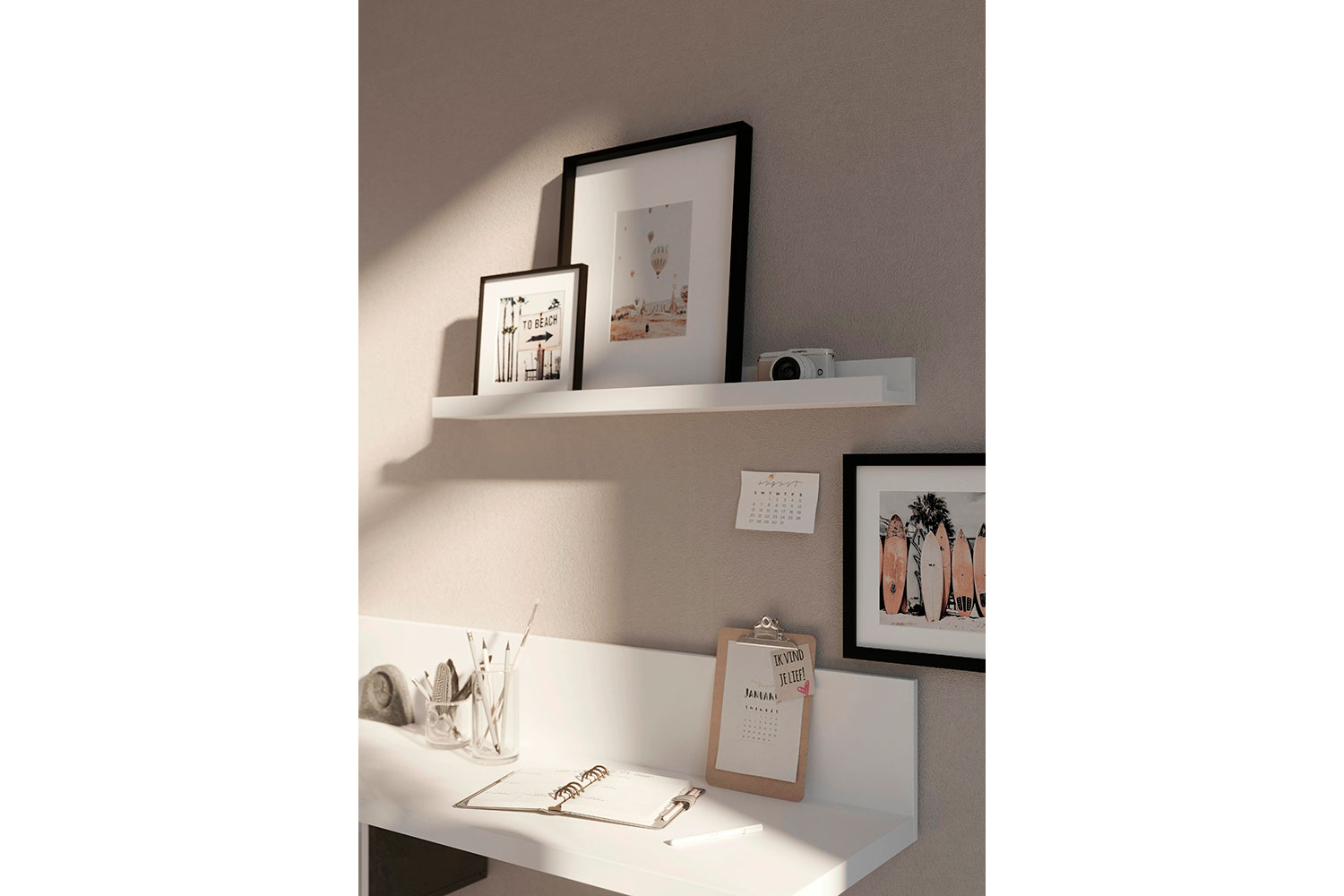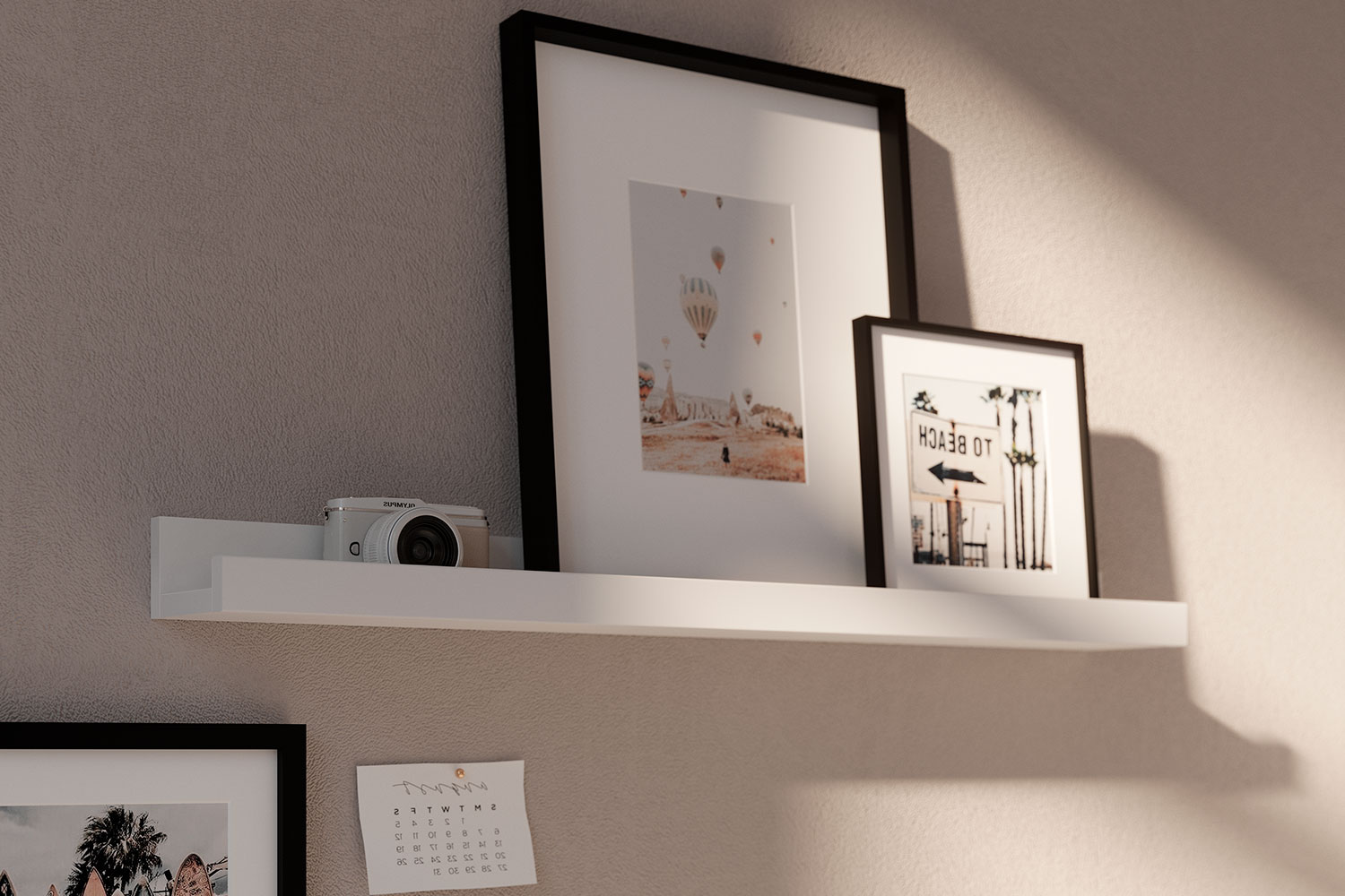 Полку можно использовать в композиции — комбинировать несколько вариантов размеров, чтобы создать настоящую галерею семейных фотографий или картин. Передний ограничительный профиль не даст соскользнуть предметам с полки.