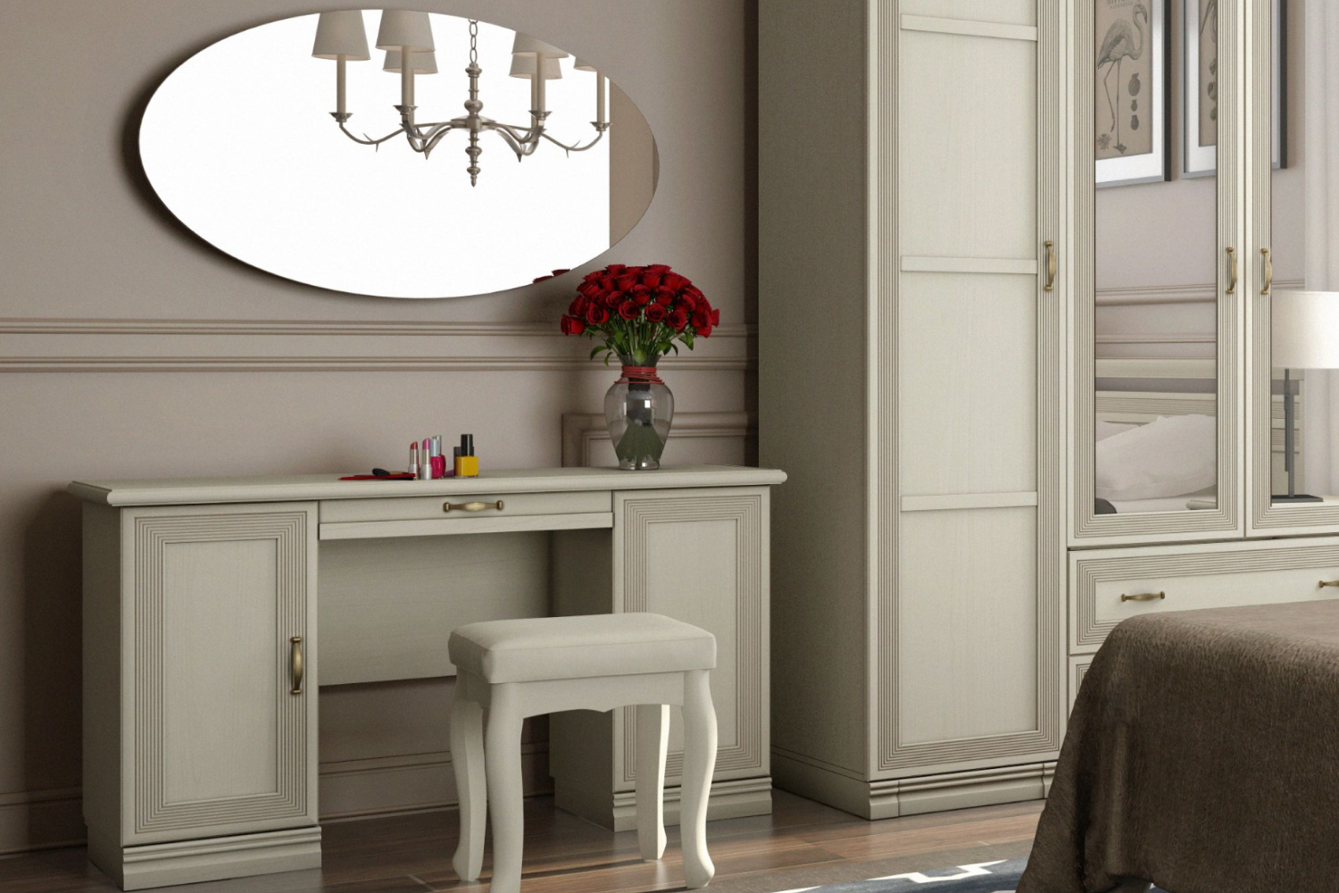 Чтобы сделать интерьер более завершенным, вы можете дополнительно приобрести металлические аксессуары в бронзовых оттенках и абстрактные постеры с яркими акцентами. Для большего удобства композицию можно завершить мягким пуфом или банкеткой в тон мебели. Конечно же, не забудьте про туалетный столик, который сделает утренние и вечерние ритуалы еще приятнее.