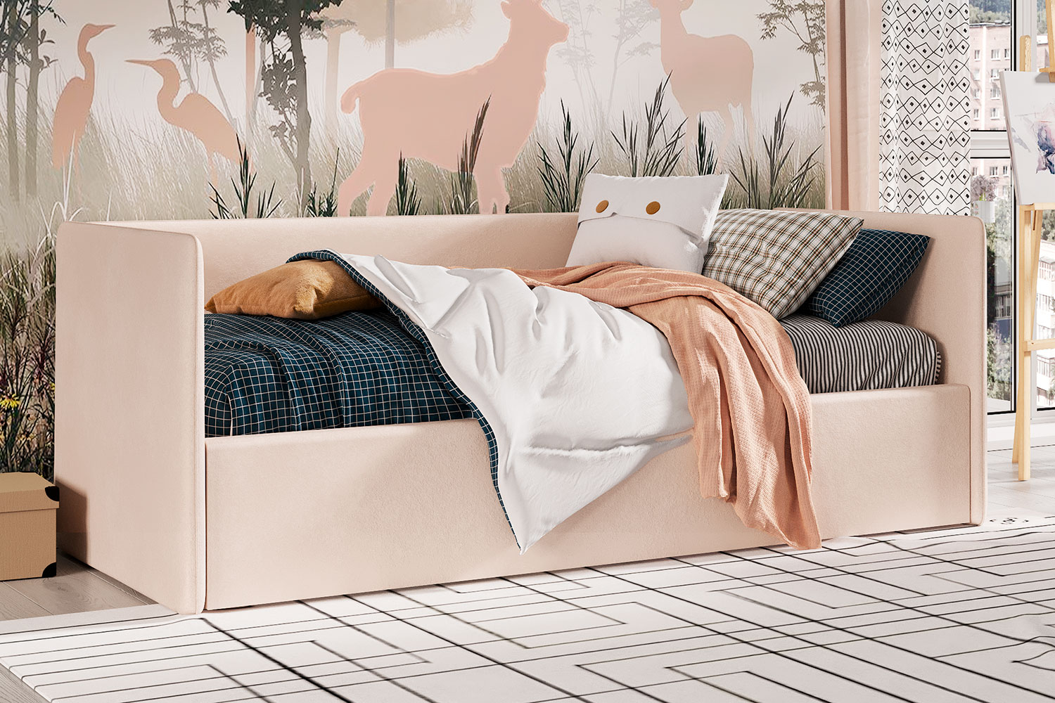 – описание: цвет бежевый, материал обивки велюр, размер спального места 90 х 190 см, стиль современный, скандинавский.