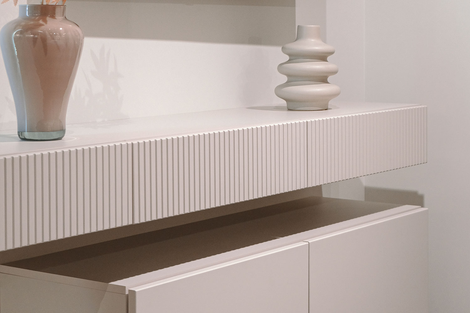 - Тумба Дольче ДЛ-343.02 навесная с тремя выдвижными ящиками и фасадами с фрезеровкой;