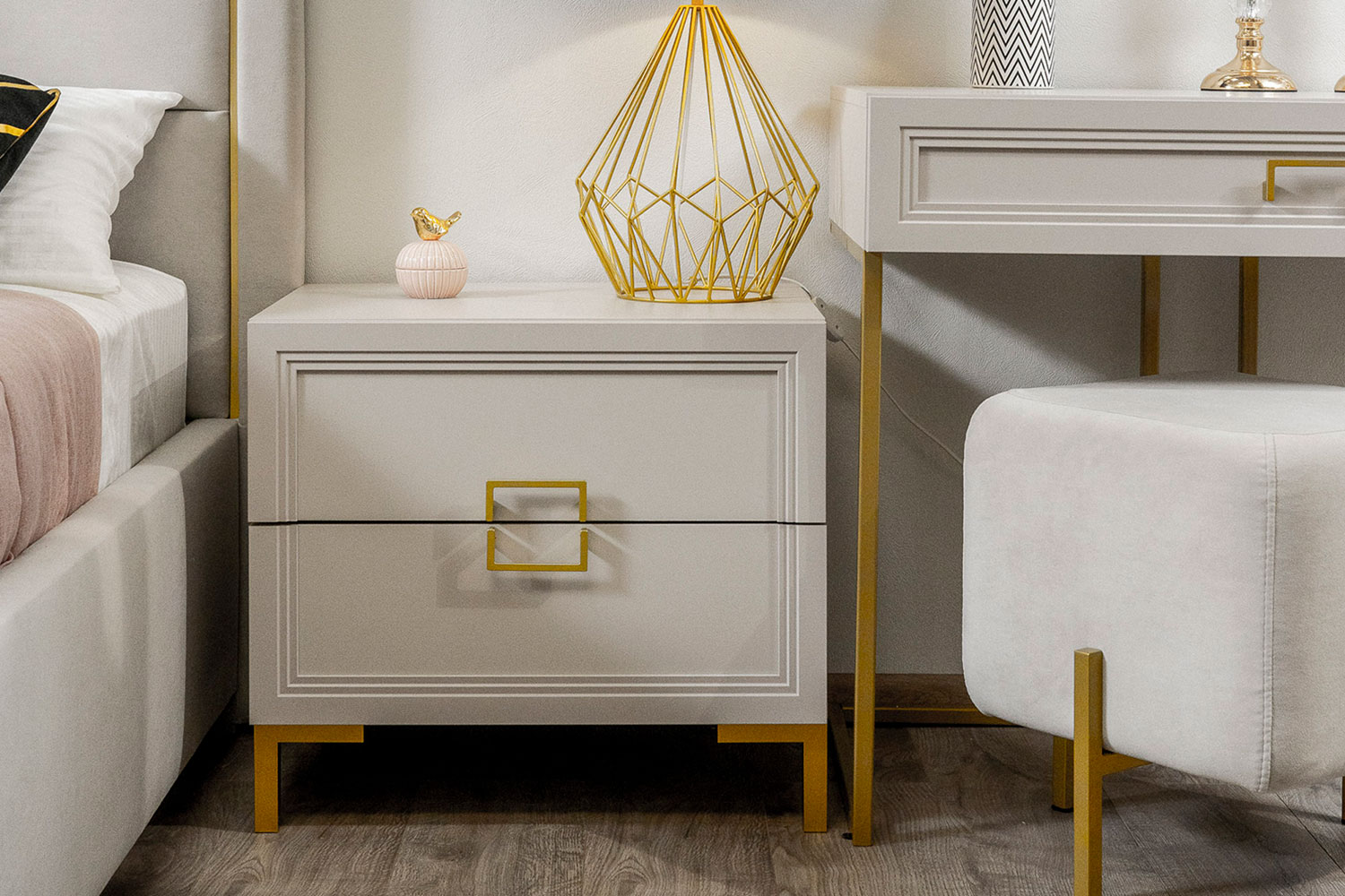- Основу дизайна составляет геометрический символ — квадрат. Это видно по золотым матовым ручкам на тумбах;
