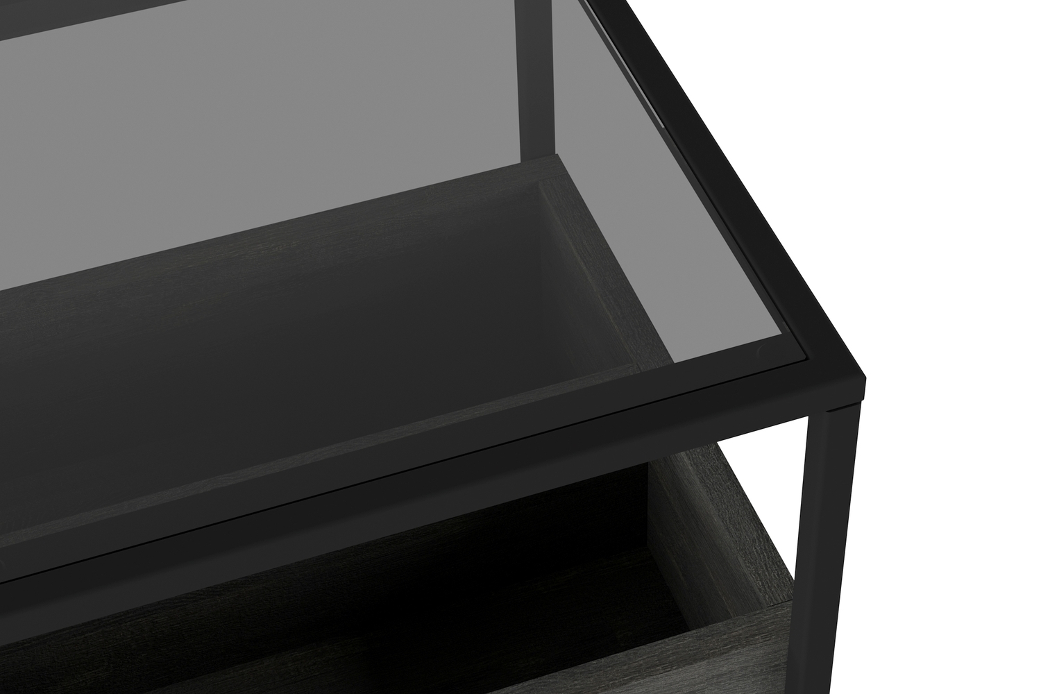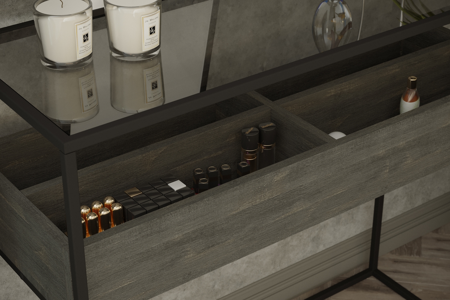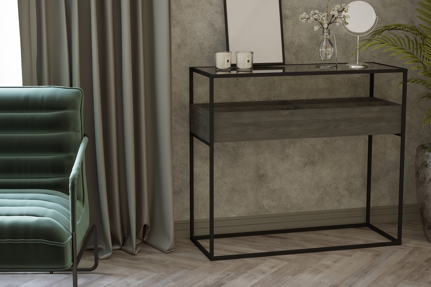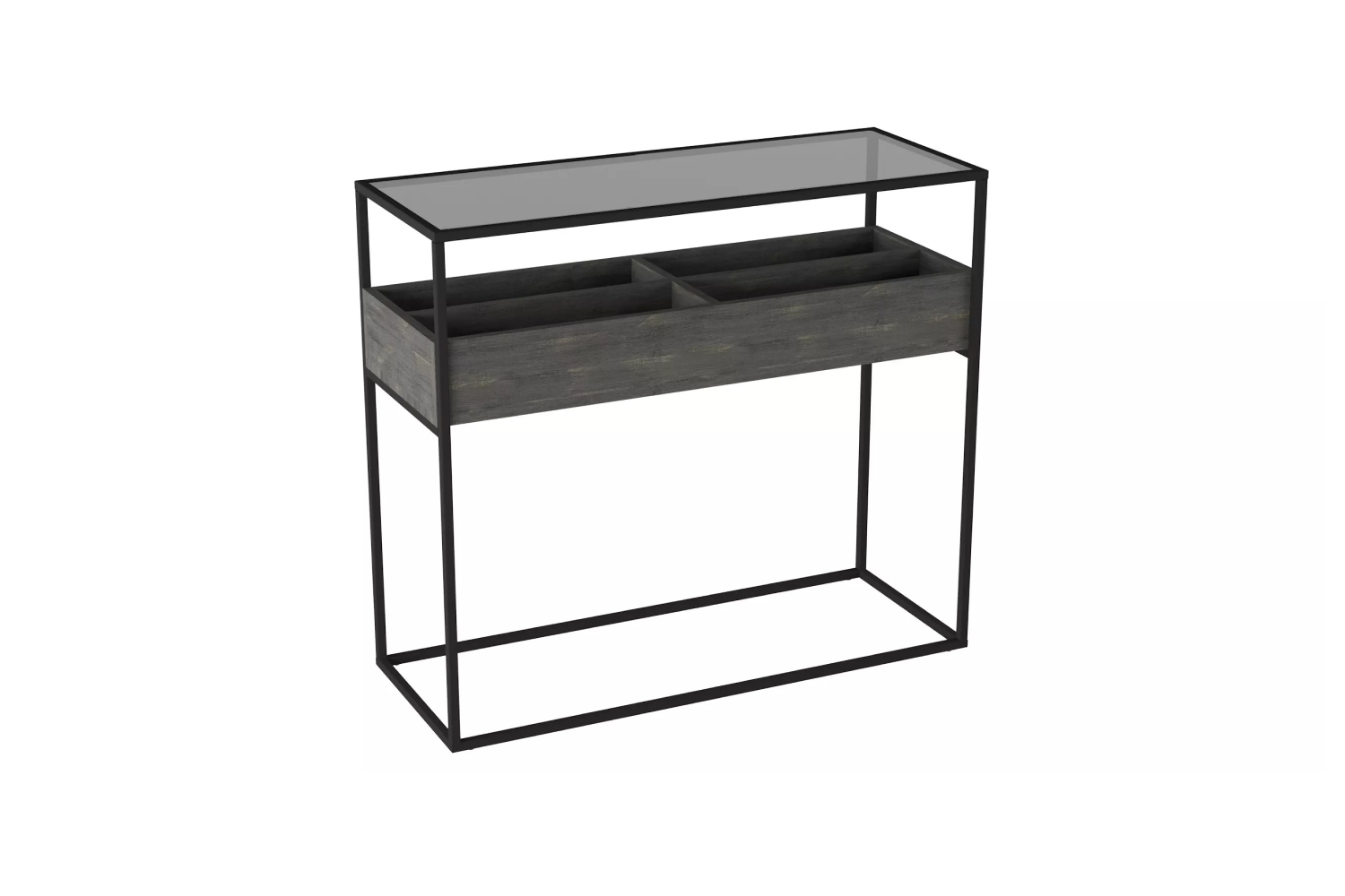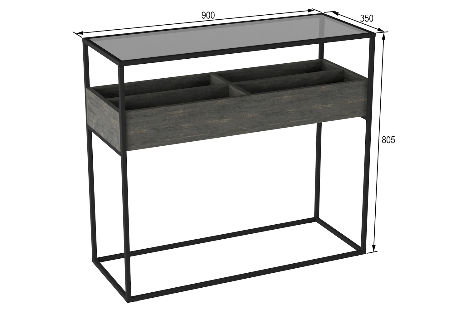 Консоль Касс выполнена в современном лаконичном стиле и уместно дополнит интерьер спальной комнаты или прихожей. Стильная консоль приковывает внимание прежде всего своим исполнением: комбинацией материалов. Стеклянная столешница из тонированного закаленного стекла в сером цвете дополнена ячейками из ЛДСП для удобного хранения подручных вещей. А прочный металлический каркас толщиной 15 мм обеспечивает высокую прочность и устойчивость.