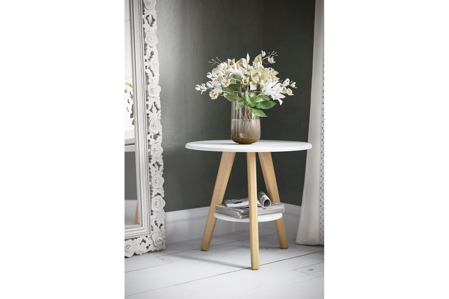 Круглый журнальный столик «Хьюг» безусловно оценят поклонники скандинавского стиля. Легкость форм в сочетании с дизайнерским цветовым решением стола — залог отличного дополнения диванной зоны, домашней гостиной или офисного кабинета. Такие журнальные столики позволяют разместить на своей поверхности чашку кофе, предметы интерьера, рамки с фото, вазы и прочее. Лаконичная и элегантная модель, станет функциональным украшением интерьера в современном стиле.