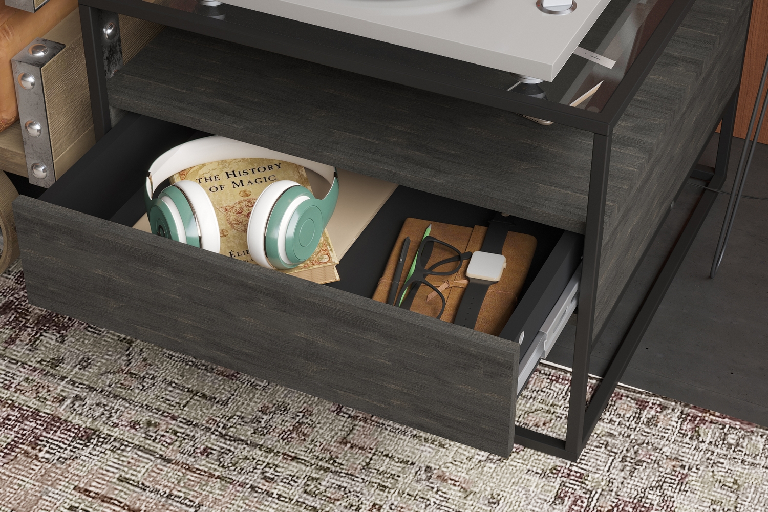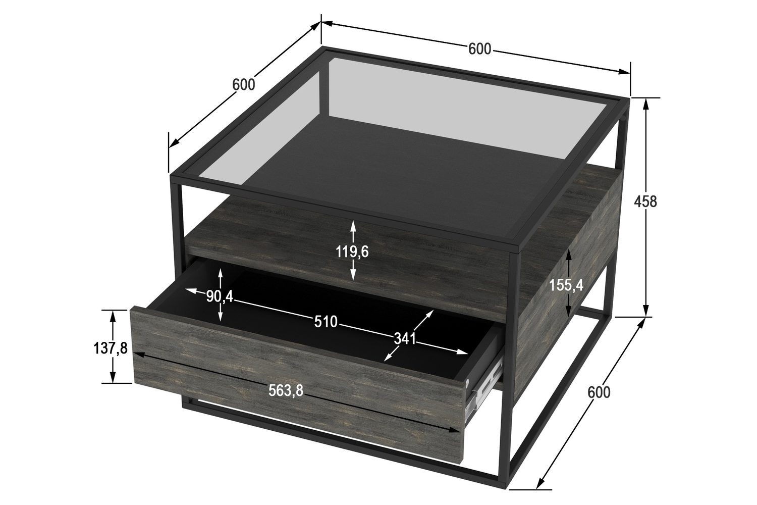Журнальный стол «Эйд» выполнен в современном лаконичном стиле и уместно дополнит интерьер гостиной. Стильный столик приковывает внимание прежде всего своим исполнением: комбинацией используемых материалов. Стеклянная столешница из тонированного стекла дополнена полкой и ящиком для удобного хранения подручных вещей.