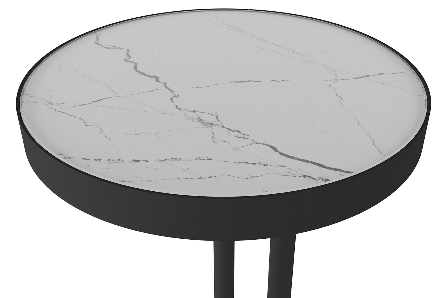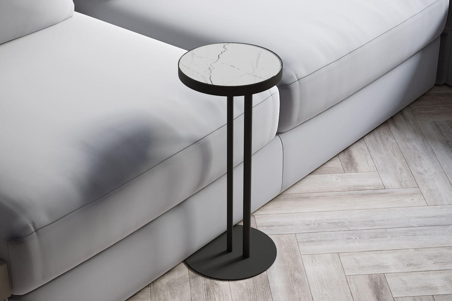 Стол журнальный «Хьюго» — элегантная в своей простоте модель в современном стиле. Основание и столешница соединены двумя опорами. За счет того, что они смещены к краю основания, столик можно установить вплотную с диваном или мягким креслом. Прочная конструкция столика полностью изготовлена из металла в черном цвете. Круглая столешница выполнена в стекле с УФ-печатью под мрамор.