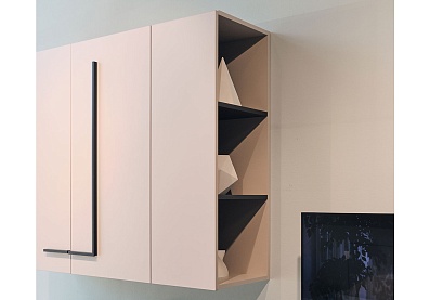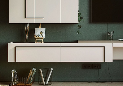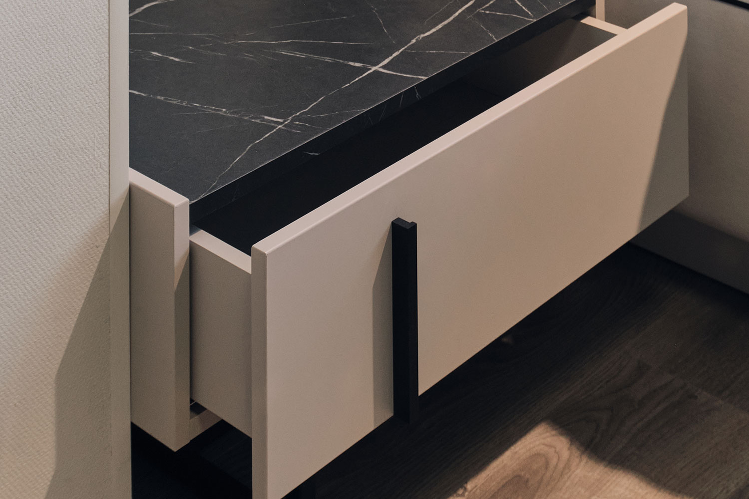 Все модули гармонично сочетаются друг с другом. Черный акцентный мрамор добавляет коллекции изысканности и роскоши, а выразительная геометрия тонких черных ручек на фасадах, перетекающая в линию опор, придают ей современный вид.