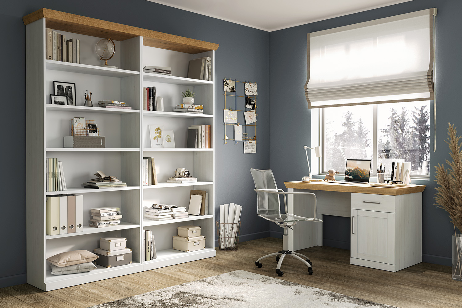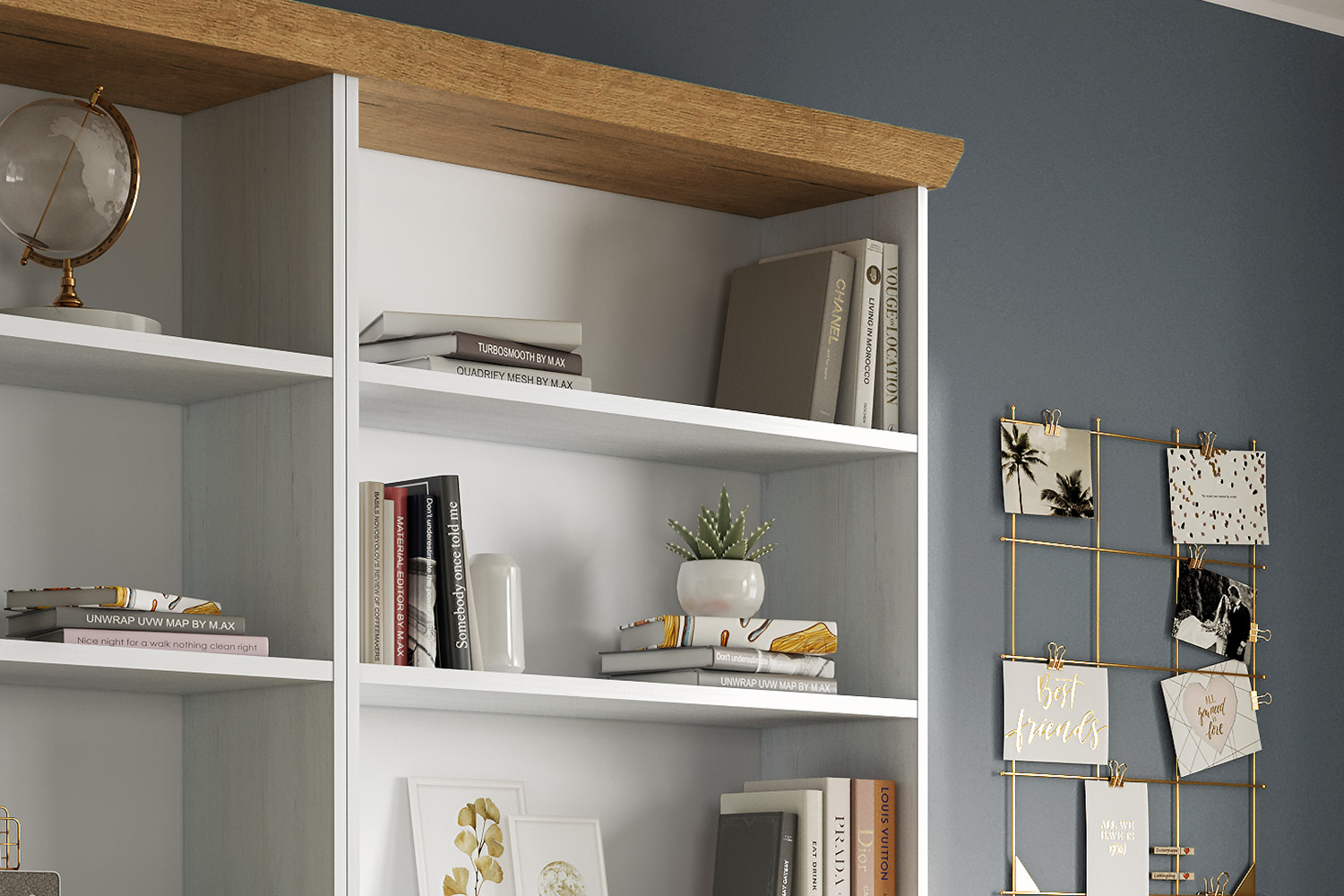 - Мебель выполнена в цвете «блан шене», верхние крышки стеллажей и стола — в цвете «дуб бунратти»;
