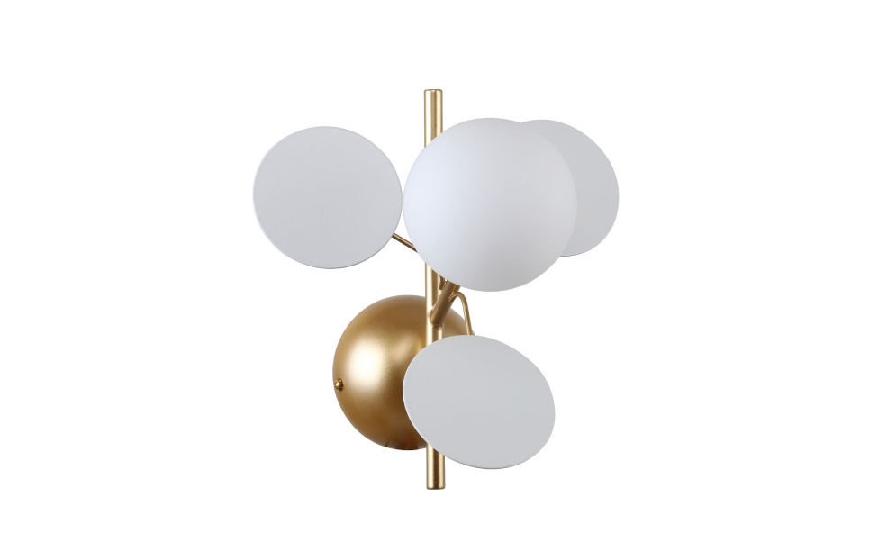 Коллекция Bliss – это гармоничное сочетание белого и золотого цветов, представляющее собой переосмысленную версию более разноцветной коллекции Multi Bliss. В основе обеих коллекций лежит одна флористическая идея, но Bliss утонченно акцентирует внимание на элегантности белого и роскоши золотого. Подойдет в интерьеры различной стилистики - от прованса до эклектики. Металлический каркас золотого цвета, круглый стеклянный плафон молочного цвета, декоративные круглые белые пластины, декоративный золотой шар.