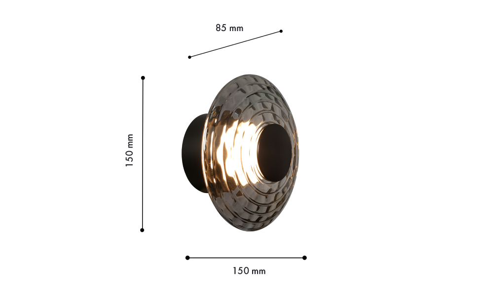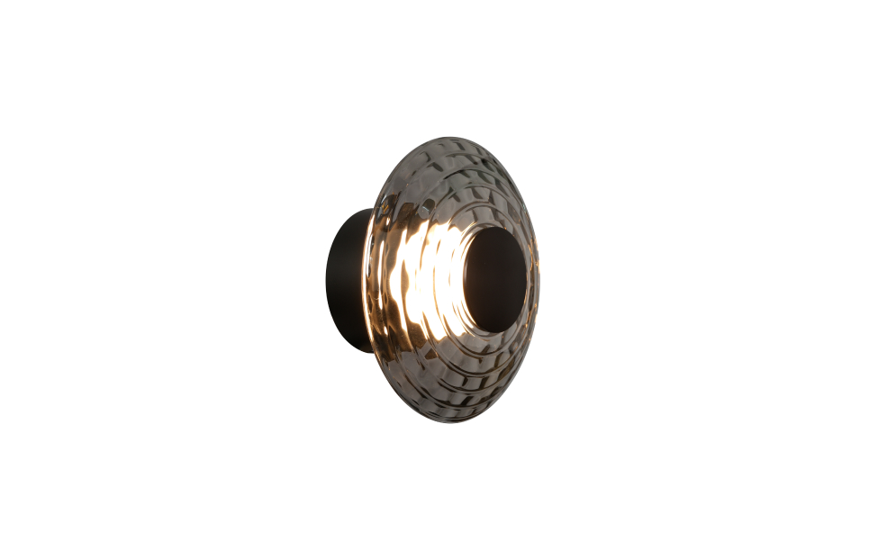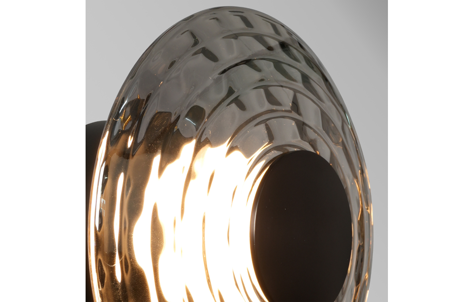 В основе дизайна светильников Claros лежат стеклянные закругленные фактурные плафоны, напоминающие изящные тарелки, между которыми встроены модули LED, создающие мягкое и комфортное освещение. Коллекция включает в себя одиночные подвесы, люстры, а также два вида настенных светильников, что позволяет создавать комплексное освещение пространства в едином стиле. Люстры можно легко комбинировать в оригинальные световые композиции, используя универсальные крепления, что дает простор для творческих решений и индивидуального подхода к оформлению интерьера. Металлический каркас черного матового цвета, закругленный фактурный плафон из стекла дымчато-серого цвета, LED-модуль
