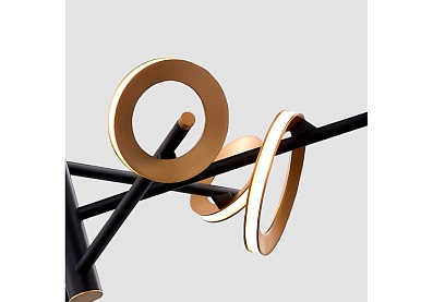 Коллекция Jongleur демонстрирует искусство баланса и динамики, где каждый элемент словно находится в постоянном движении. В качестве плафонов использованы объемные кольца цвета матовой латуни, которые светятся по периметру с помощью встроенной LED-ленты. Они закреплены под разным углом к тонкому черному каркасу светильника, будто вращаются вокруг основания, словно цирковые обручи хула-хуп.