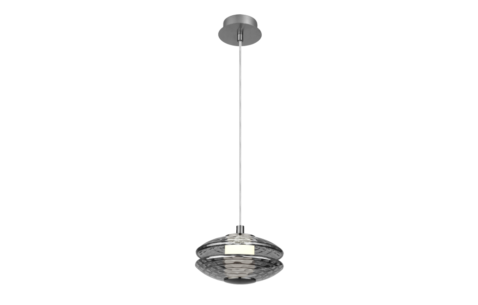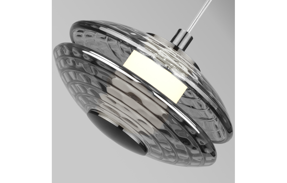 В основе дизайна светильников Claros лежат стеклянные закругленные фактурные плафоны, напоминающие изящные тарелки, между которыми встроены модули LED, создающие мягкое и комфортное освещение. Коллекция включает в себя одиночные подвесы, люстры, а также два вида настенных светильников, что позволяет создавать комплексное освещение пространства в едином стиле. Люстры можно легко комбинировать в оригинальные световые композиции, используя универсальные крепления, что дает простор для творческих решений и индивидуального подхода к оформлению интерьера. Металлический каркас цвета матового никеля, закругленный фактурный плафон из прозрачного стекла, регулируемая высота, LED-модуль.