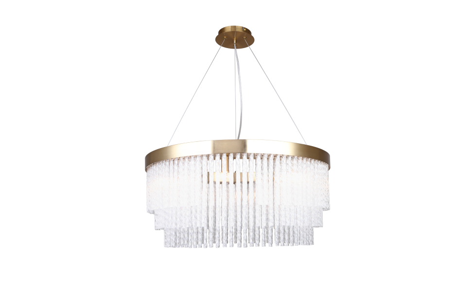 Коллекция Bellinda выполнена в стиле американской классики. Каскадная конструкция состоит из закрученных вокруг своей оси стеклянных трубочек. Этот декор скрывает лампы и мягко пропускает свет. Цвет латуни придает люстрам изысканный вид. Крепление на струнах позволяет регулировать высоту подвеса.